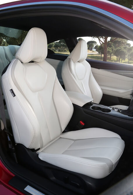 Antes de dirigirme a las plazas traseras compruebo la buena posición de conducción que me brinda el nuevo Infiniti Q60. La adquiero rápido gracias a sus confortables asientos con múltiples reglajes, que, además, agarran el cuerpo en curva de forma más que satisfactoria. Me traslado a las banquetas traseras, y en un arduo trabajo, por fin me acomodo. El acceso es complicado por la forma del techo, la maniobrabilidad del asiento delantero y la posición del cinturón de seguridad de éste. Tras esta pequeña gymkhana, compruebo que mis rodillas tienen el espacio suficiente como para viajar con comodidad, también los hombros, lógico al ser un cuatro plazas, pero no mi cabeza, porque toca, para mi desgracia, no con el techo, sino con la luna -a mi cabeza vienen esos días soleados que tanto añoro del verano-, y eso que solo presumo de 1,78 m de altura, estatura que no me serviría ni para jugar en la liga universitaria de baloncesto. Y hablando de espacio, el de la carga cubica 342 litros, bastante menos que el trío alemán y dos litros más que el Lexus RC 300h. Además, el maletero tiene forma irregular y el piso no es plano. Las apariencias engañan: lo cierto es que caben dos maletas de viaje y alguna bolsa más.