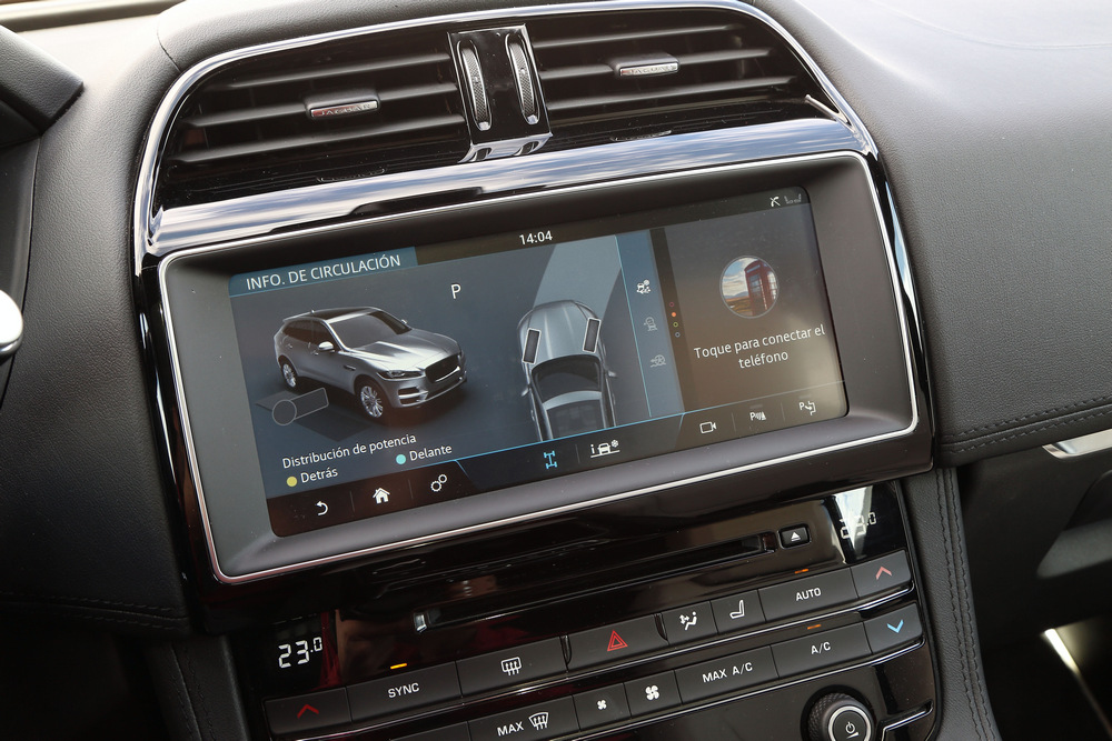 En líneas generales, el habitáculo del Jaguar F-Pace ofrece una imagen que transmite lujo y calidad sin por ello renunciar a la tecnología. Llama la atención el suntuoso tapizado de cuero Wndsor (imagen) que cubre los asientos o el revestimiento del techo. El salpicadero está dominado por la pantalla del sistema InControl Touch Pro (imagen), que con 10,2 pulgadas, ofrece capacidades táctiles y un funcionamiento muy logrado e intuitivo: en cuestión de minutos descubrirás cómo moverte por los menús y disfrutar de las las numerosas funciones que ofrece. Esta gran pantalla se complementa en el caso de la unidad probada con un cuadro de mandos digital de 12,3 pulgadas (imagen). asas