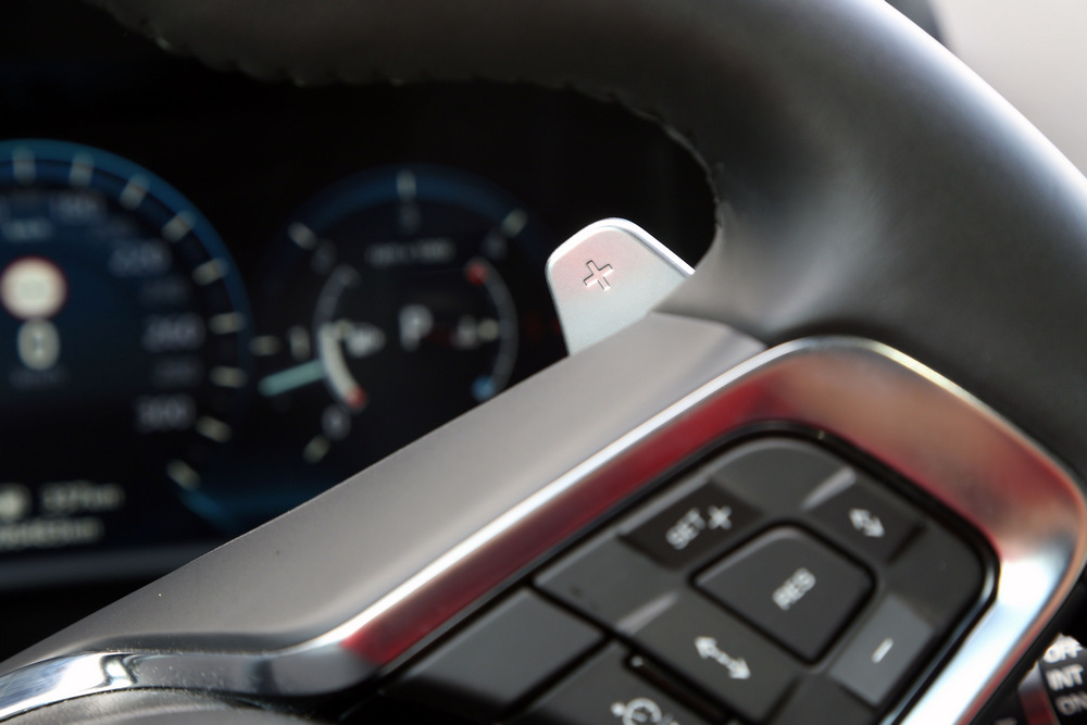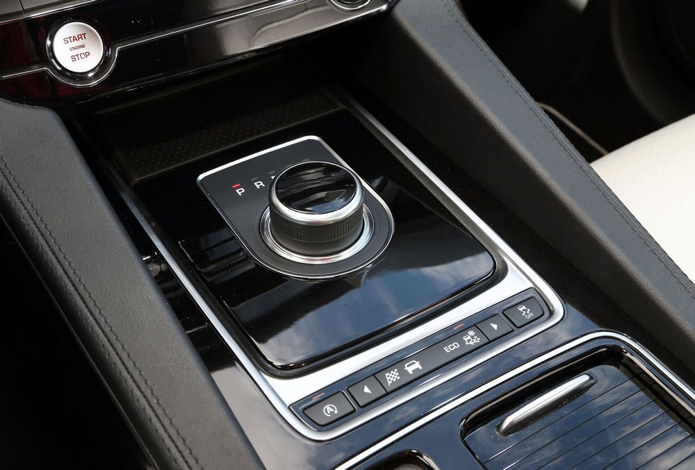 Debajo del capó de este F-Pace First Edition encontramos el conocido propulsor 3.0 V6 turbodiésel de la marca, una mecánica que en este caso produce 300 CV de potencia y un par motor de 700 Nm. Como este último está disponible desde tan solo 2.000 vueltas y el coche pesa menos que sus rivales, la respuesta siempre es contundente y gana velocidad con mucha facilidad sin que se transmita al habitáculo de manera clara. En esto también tiene que ver la caja de cambios que va asociada a este bloque, la conocida ZF de ocho velocidades, que como de costumbre, ofrece un funcionamiento muy satisfactorio y se maneja a través de una ruleta (imagen) o desde las levas ubicadas en el volante (imagen).