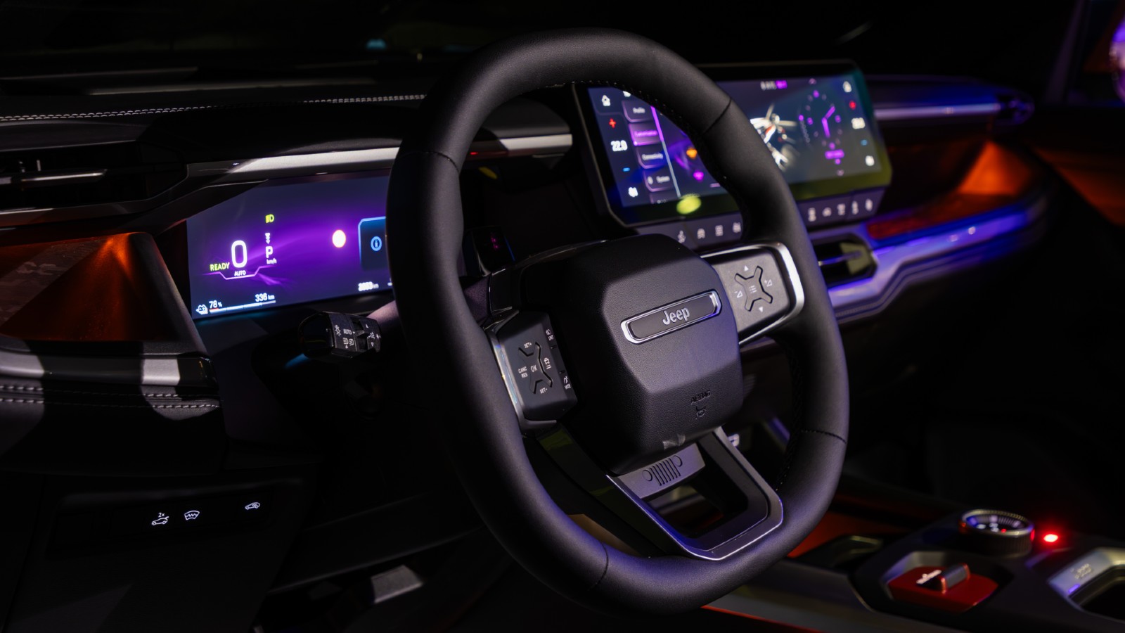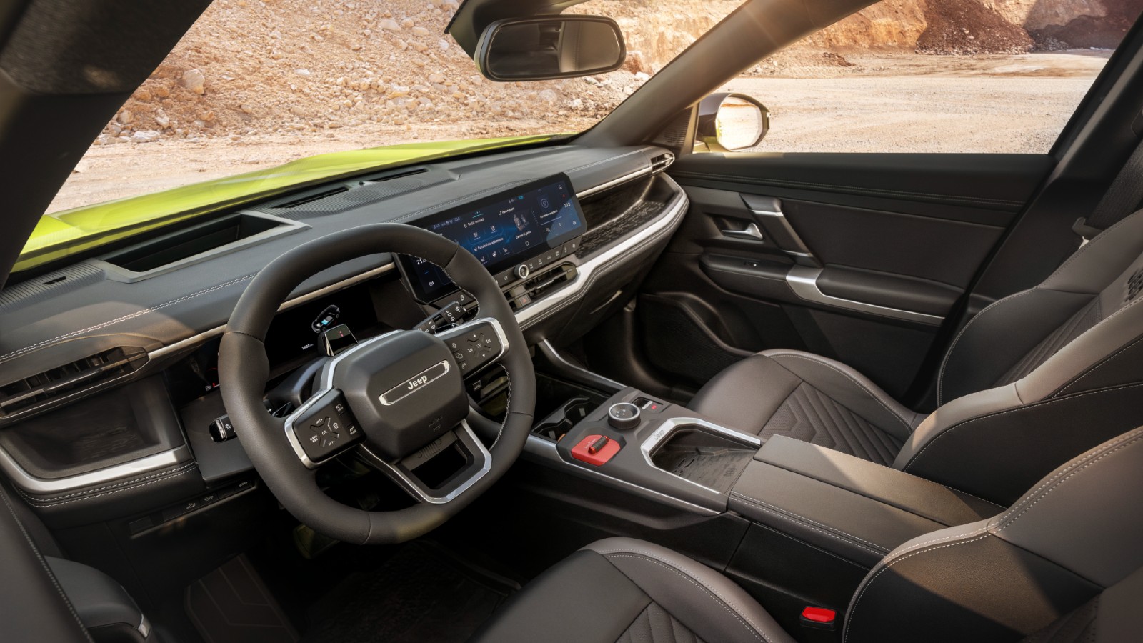 Eso de cara al exterior, de cara al interior el puesto de conducción del Jeep Compass 2026 nada tiene que ver con el anterior. Lo primero que ven nuestros ojos es un nuevo sistema multimedia con una pantalla panorámica de 16 pulgadas, con el sistema multimedia, valga la redundancia, aquí sí, del grupo Stellantis, porque los gadgets son prácticamente los mismos, pero tenemos un volante pequeñito y robusto, con una buena ergonomía y un cuadro de instrumentos que no está colocado ni muy arriba, ni muy abajo y, además, es convencional.