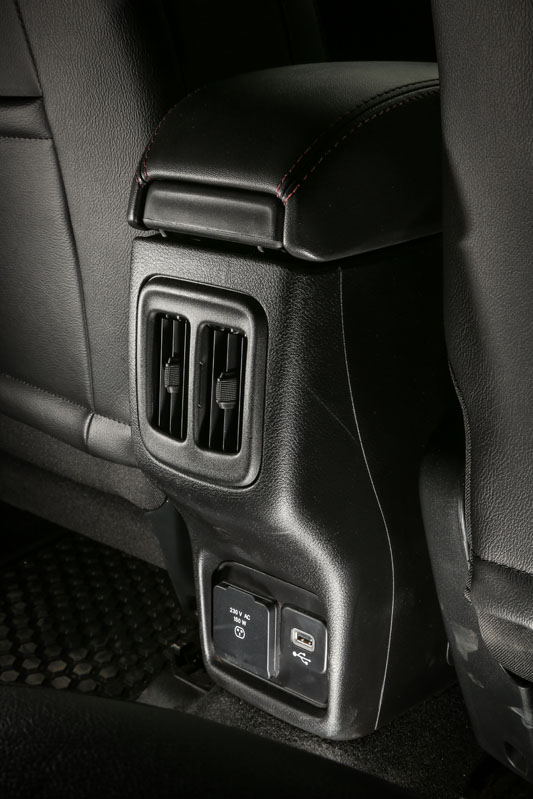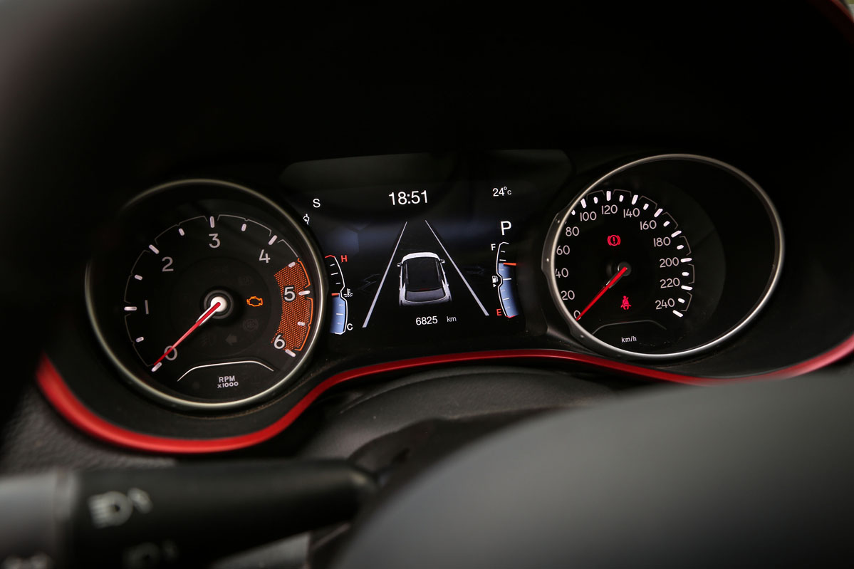 El interior también presume de alguna diferencia que otra como la tapicería en tela y piel Techno en negro con pespuntes rojos o las molduras en este último color que rodean el cuadro de instrumentos, la base de la palanca del cambio y los altavoces. Desde los cómodos asientos por su mullido y ajuste lumbar eléctrico, que es de serie, diviso el cuadro de mandos y la consola. El primero de los elementos combina unas esferas analógicas con una pantalla digital de considerables dimensiones. El segundo, adopta de forma física los botones esenciales. Por suerte no necesitamos navegar por el sistema de infoentretenimiento para apagar o encender la calefacción, subir o bajar la temperatura o el volumen de la radio... Que si quieres también puedes hacerlo, porque Jeep ofrece ambas opciones, pero siempre tienes tu botón físico, pasando de esa absurda moda de eliminar los botones. ¡Buen trabajo!