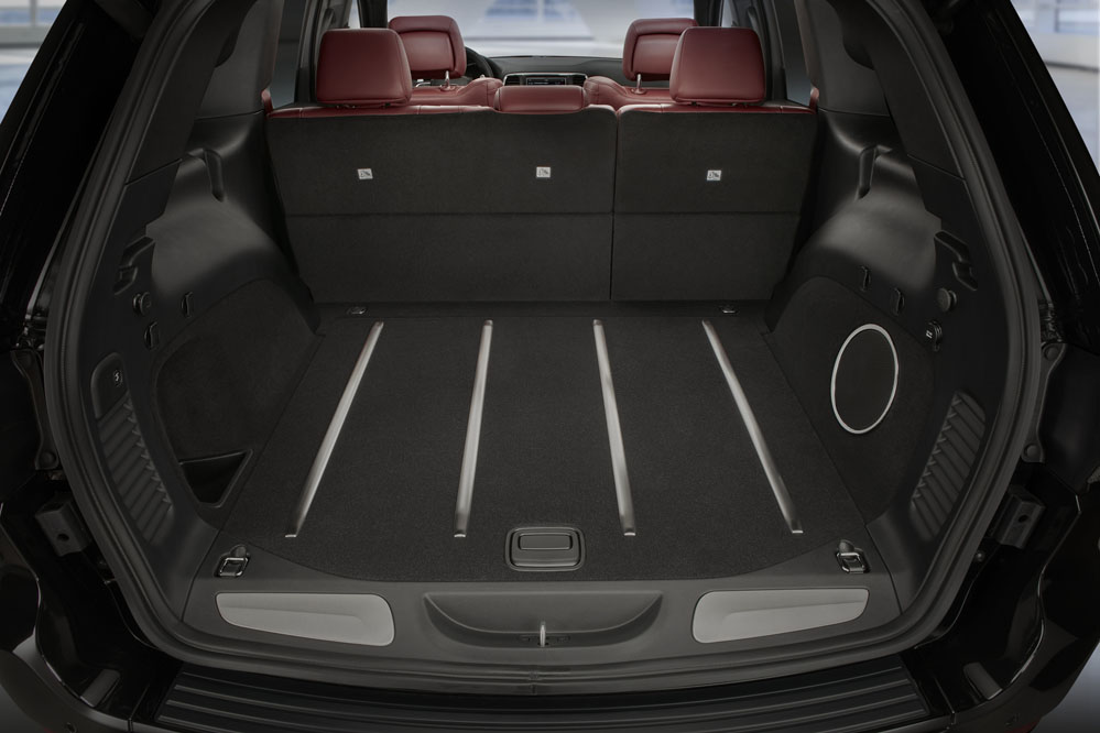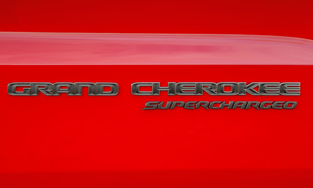 Su perfil pone de manifiesto la clase de vehículo que es, porque sus enormes llantas de aluminio forjado de 20 pulgadas esconden unos frenos Brembo, que se distinguen por sus pinzas amarillas y por el gran diámetro de los discos delanteros. Y es que son los más grandes jamás ofrecidos en un vehículo Jeep. Como debe ser, no todo es cuestión de estética, porque son capaces de frenar el coche de 60 a 0 mph (96 a 0 km/h) en 43,9 metros, a pesar de sus 2.433 kilogramos. Además, en los laterales, a los anagramas Grand Cherokee se le une otro con la palabra Supercharged. Los marcos de las puertas vienen en negro brillante, el mismo tratamiento que se le ha dado en su parte posterior a la chapa Jeep, así como a la Trackhawk. Pero lo que realmente le diferencia son sus cuatro salidas de escape -realizadas en un material más resistente a altas temperaturas-, con dos a cada lado de 10,16 cm cada una y pintadas, cómo no, en negro brillante; así como el difusor, totalmente funcional.