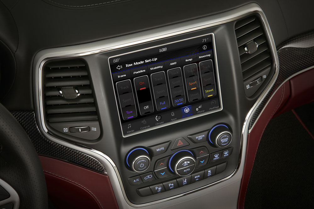 Mientras realizo la prueba del Jeep Grand Cherokee Trackhawk 2018 puedo seleccionar diferentes tipos de modos de conducción: Tow, para poder remolcar hasta 3.265 kg gracias a que el par pasa a las ruedas delanteras para tener la mejor capacidad de arrastre dentro del segmento de los SUV deportivos; Snow, para superficies deslizantes, y Auto, con un reparto más equilibrado pero sin llegar al 50/50. La deportividad la ofrecen el Sport y el Track, donde la entrega de par es más contundente, la suspensión, más dura y la transmisión, más rápida. También tiene la función ‘Launch Control’, con el que pasa de 0 a 60 mph (0 a 96 km/h) en solo 3,5”.