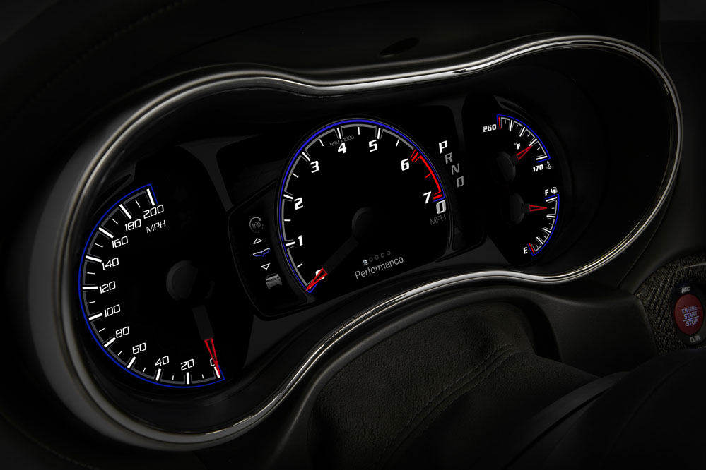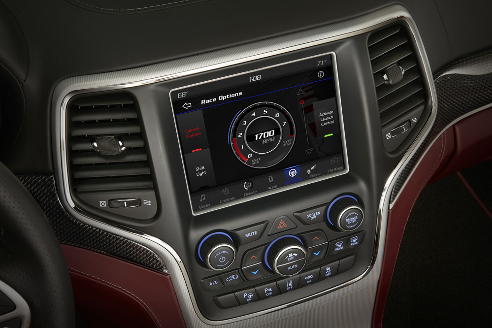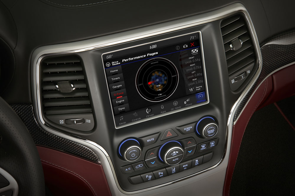 Esa deportividad que emana su exterior también se respira en el interior. Lo primero es el color de su llave, que es roja y que es la única opción. No existe la llave negra del Charger SRT Hellcat (prueba) que pone limitaciones a las prestaciones del coche. Lo que sí tiene es modo ‘aparcacoches’, con el que la potencia se verá reducida y las levas quedan inutilizadas. Pero la llave no es necesaria para arrancar este todocamino de 707 CV, porque el encendido es por botón, que también es rojo y está rodeado de molduras de fibra de carbono con hilo metálico, que le da apariencia 3D. En el momento en que su V8 6.2 con logo Hellcat, toda una declaración de intenciones, comineza a sonar, aparece en la pantalla del cuadro de instrumentos la palabra ‘Supercharged’. Si estas señas no te parecen suficientemente deportivas, el tacómetro digital en el centro del mismo es un indicador muy claro, tacómetro que, por cierto, da la impresión de tratarse de uno analógico. Marca 320 km/h, aunque el SUV 'sólo' es capaz de alcanzar 290 km/h. Está montado sobre una pantalla de siete pulgadas que es configurable: entre las múltiples opciones se puede seleccionar una denominada ‘Trackhawk’, que brinda información importante para circuito: velocidad, velocidad máxima alcanzada, fuerzas G, tiempos… Y por si aún tienes dudas de su deportividad, la pantalla del sistema de infoentretenimiento, que es de 8,4 pulgadas y que equipa el sistema Uconnect 4, tiene de fondo un piano de circuito.