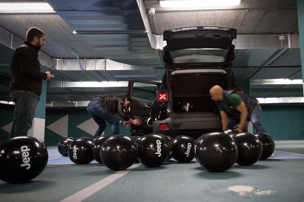 Jeep nos preparó una entretenida Gymkhana por el centro de Madrid, de tal forma que comprobásemos las aptitudes de su vehículo en la urbe. El primer reto de la prueba urbana con el Renegade Night Eagle II consistió en aparcar lo más rápido posible en un hueco bien justo. Para ello nos tuvimos que desplazar a las cocheras del metro de Madrid, situadas en la calle Virgen de Nieva, 2. Tras este desafío, en el que pudimos comprobar la buena maniobrabilidad del coche, nos dirigimos al parking del Hotel Only You de Atocha, situado en la calle Alfonso XII, 21, donde el lance era meter multitud de pelotas de playa en el maletero y en las plazas traseras; es sorprendente los balones hinchables que caben gracias a la capacidad de carga con dos filas de asientos disponibles, que es de 351 litros, y con una fila, de 1.297.