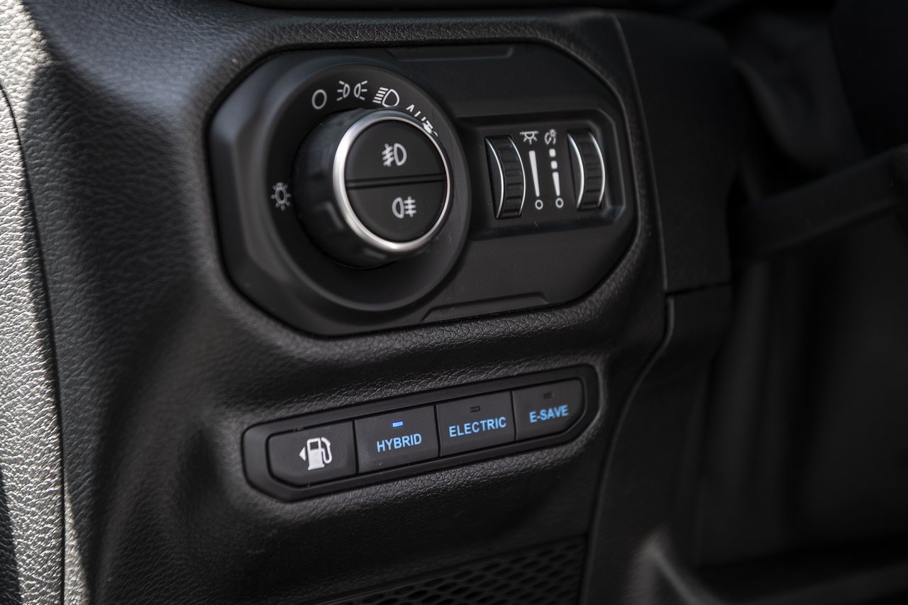 Por dentro sucede lo mismo que en el exterior, ya que salvo por algún detalle es idéntico al Wrangler normal. Las diferencias se centran en el cuadro de mandos, que ahora luce una disposición distinta necesaria para mostrar la información propia del sistema híbrido enchufable. También hay un grupo de ledes en la parte central del salpicadero que nos informan del estado de carga de la batería cuando el coche esté enchufado (son cinco ledes en total y cada uno representa un 20%). Además, hay una serie de botones específicos para manejar el sistema motriz así como detalles como costuras en blanco o azul en función de la terminación.