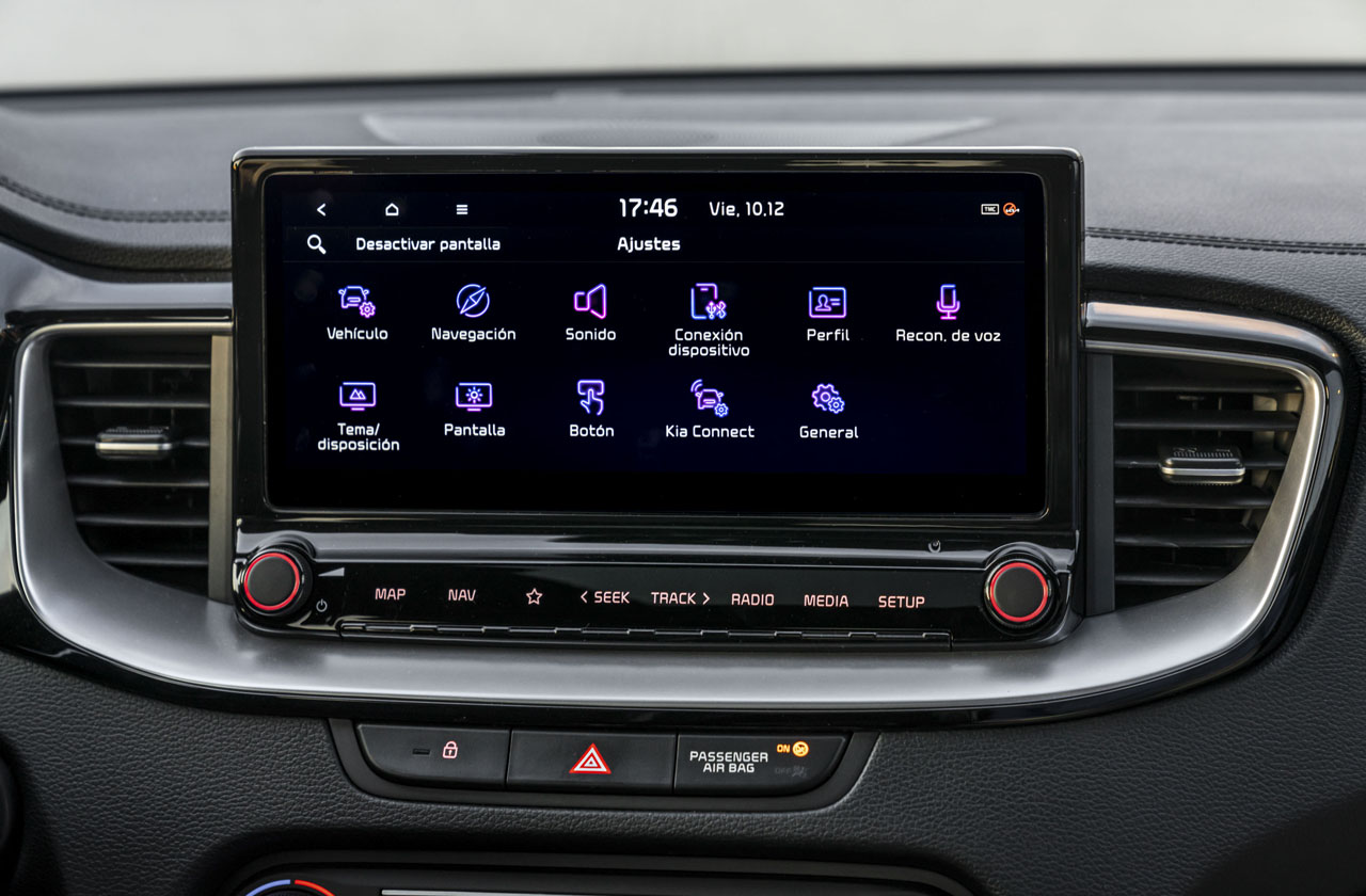 En el interior del coche de la prueba, el KIA Ceed 2021 1.5 T-GDI MHEV, destaca el nuevo cuadro de instrumentos digital de 12,3 pulgadas, que cambia su aspecto dependiendo del modo de conducción escogido, y por la pantalla del sistema de infoentretenimiento, de 10,25 pulgadas. Como te comentaba, los materiales son de calidad y parecen consistentes, con lo que gracias a ello y al diseño, ofrece una buena calidad visual, pero también al tacto.
