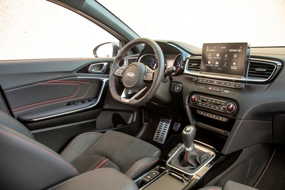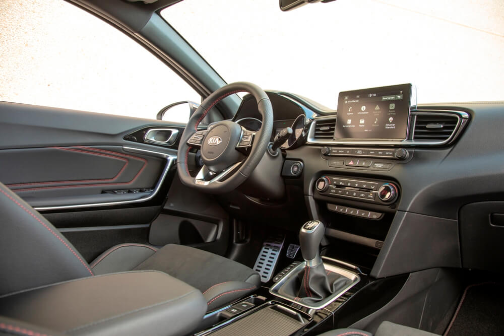 Otros elementos destacados son los materiales del salpicadero de mayor calidad, molduras metálicas, la pantalla táctil de 8 pulgadas y estilo flotante del sistema de infoentretenimiento, con los controles de audio, ventilación y calefacción situados por debajo. Pese a su marcado carácter deportivo, el Ceed GT conserva un maletero de 395 litros con un borde de carga más bajo (87 mm menos que su predecesor), un suelo del maletero dividido en dos niveles y un respaldo del asiento posterior divisible en configuración 60:40 para abatirlo y aumentar su capacidad de carga hasta los 1.291 litros.
