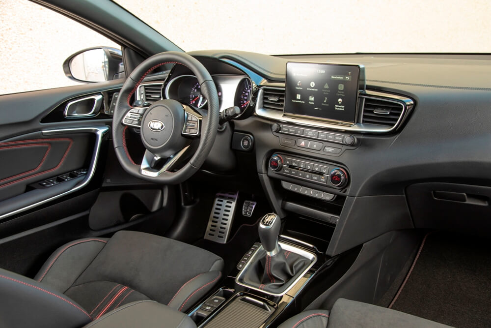 Otros elementos destacados son los materiales del salpicadero de mayor calidad, molduras metálicas, la pantalla táctil de 8 pulgadas y estilo flotante del sistema de infoentretenimiento, con los controles de audio, ventilación y calefacción situados por debajo. Pese a su marcado carácter deportivo, el Ceed GT conserva un maletero de 395 litros con un borde de carga más bajo (87 mm menos que su predecesor), un suelo del maletero dividido en dos niveles y un respaldo del asiento posterior divisible en configuración 60:40 para abatirlo y aumentar su capacidad de carga hasta los 1.291 litros.