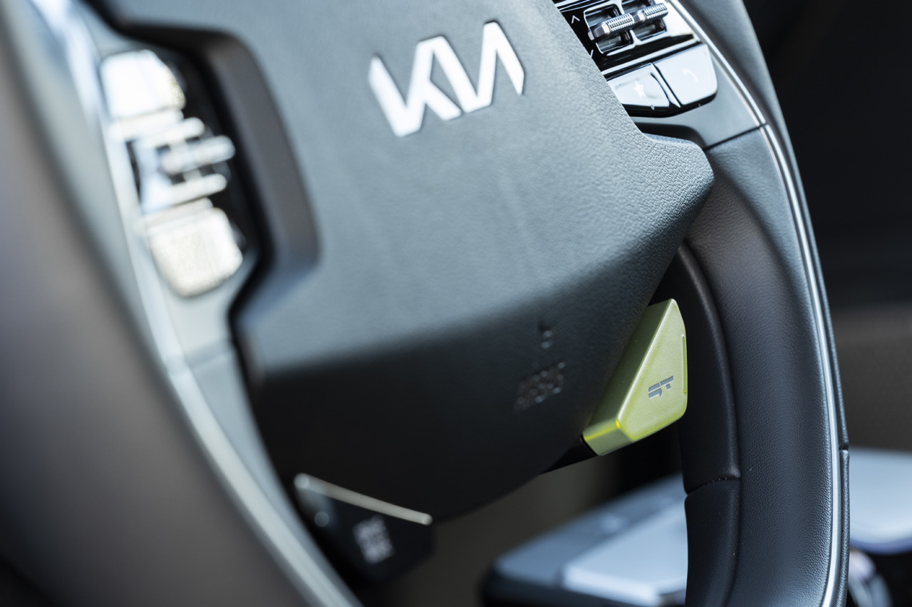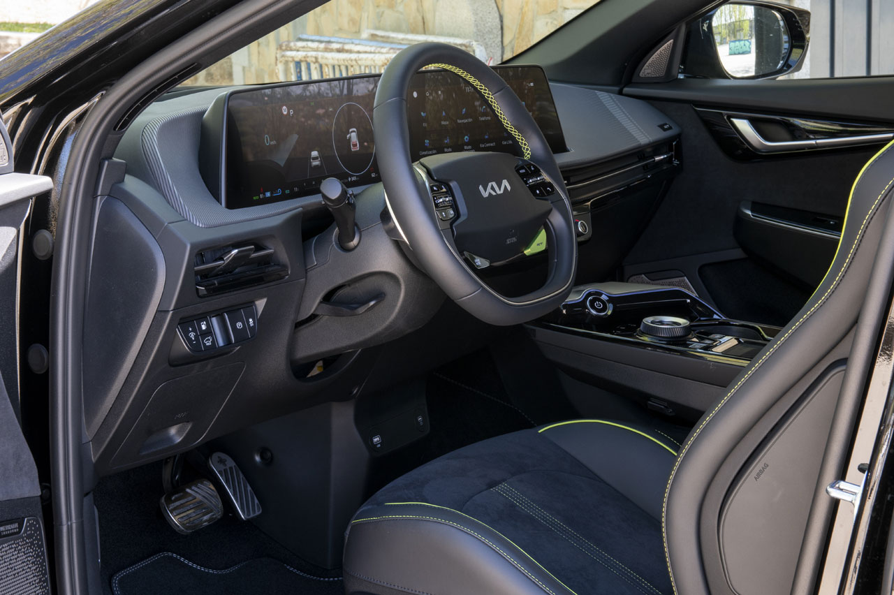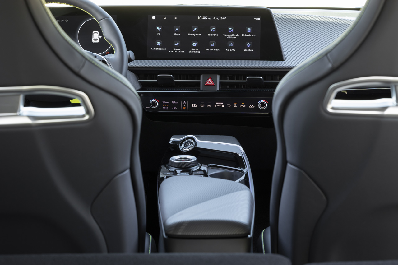 Lo mismo se puede decir de su interior, donde hay que andar muy fino para identificar a esta variante. Porque en el EV6 GT solo cambian los asientos, que básicamente son idénticos a los que puede llevar un Hyundai i30 N (prueba), los tapizados, las molduras decorativas del salpicadero o el botón adicional GT de color verde que hay en el volante. El resto es idéntico al de cualquier otro EV6.
