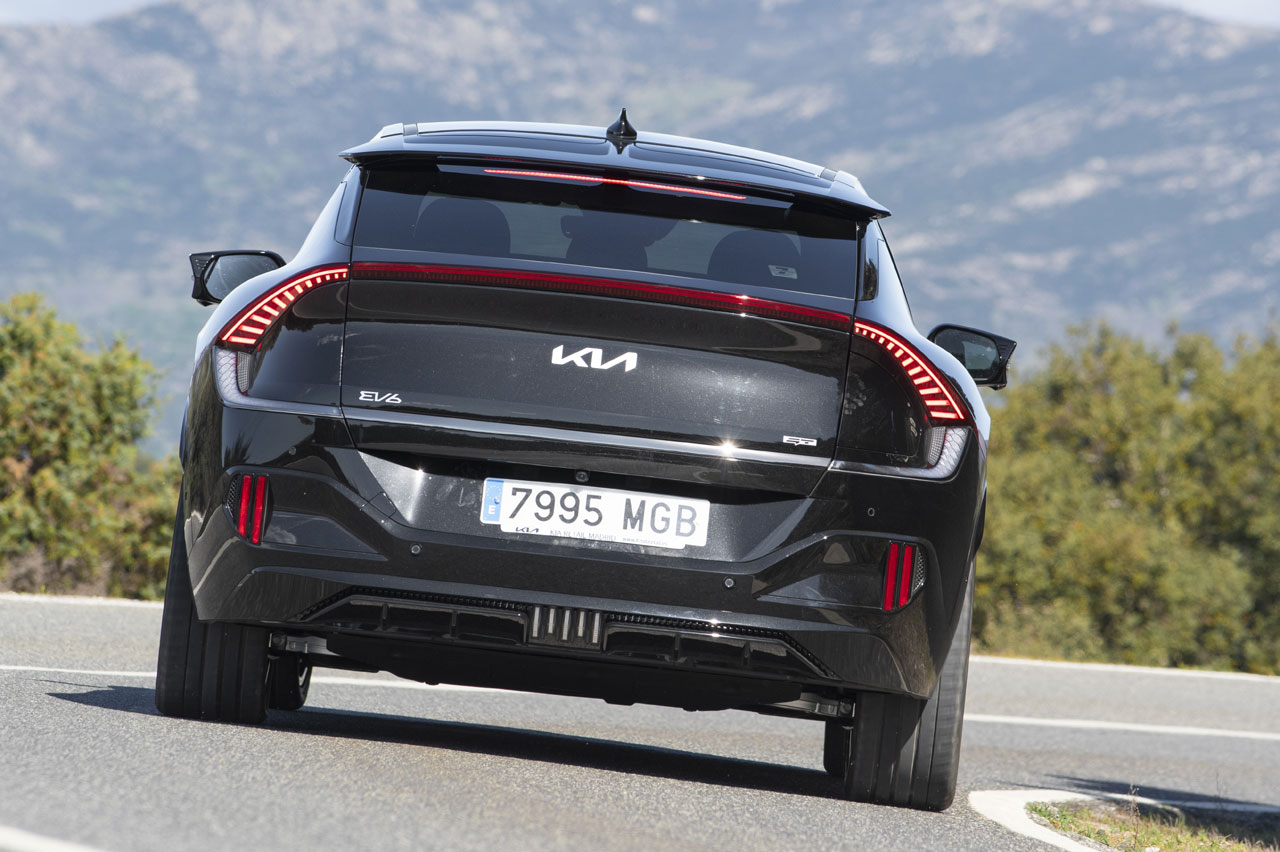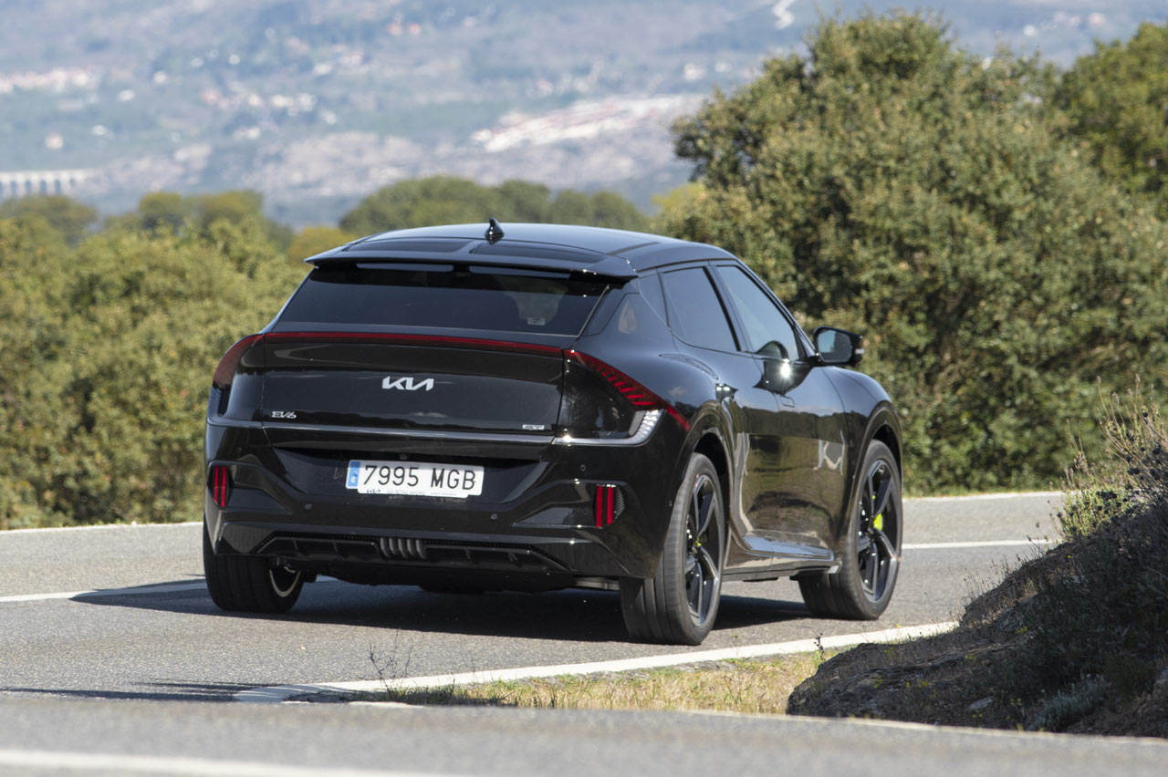 Todo esto convierte al KIA EV6 GT que pruebo en un coche muy rápido en casi cualquier circunstancia. Tiene un paso por curva muy veloz incluso a pesar de su elevado peso (2.200 kilogramos en orden de marcha). Algo que es consecuencia de su bajo centro de gravedad, de su buen reparto de pesos, del agarre de sus neumáticos y de lo efectivo que es su diferencial eLSD a la hora de trasladar toda la potencia al suelo.