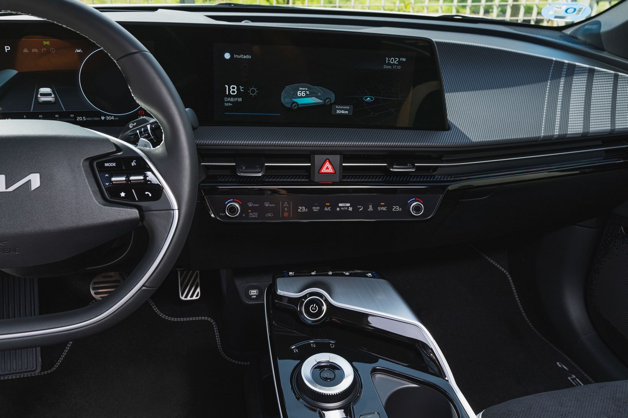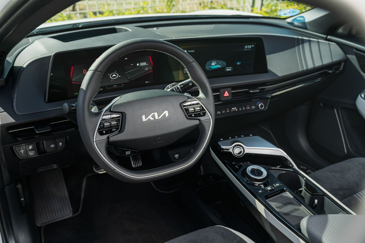 La carrocería del KIA EV6 de esta prueba es llamativa, pero el habitáculo tampoco se queda atrás en este sentido. Es vistoso, amplio y está bien ejecutado. Todos los elementos quedan muy a mano del conductor y tienen una disposición lógica, por lo que su manejo resulta muy intuitivo.