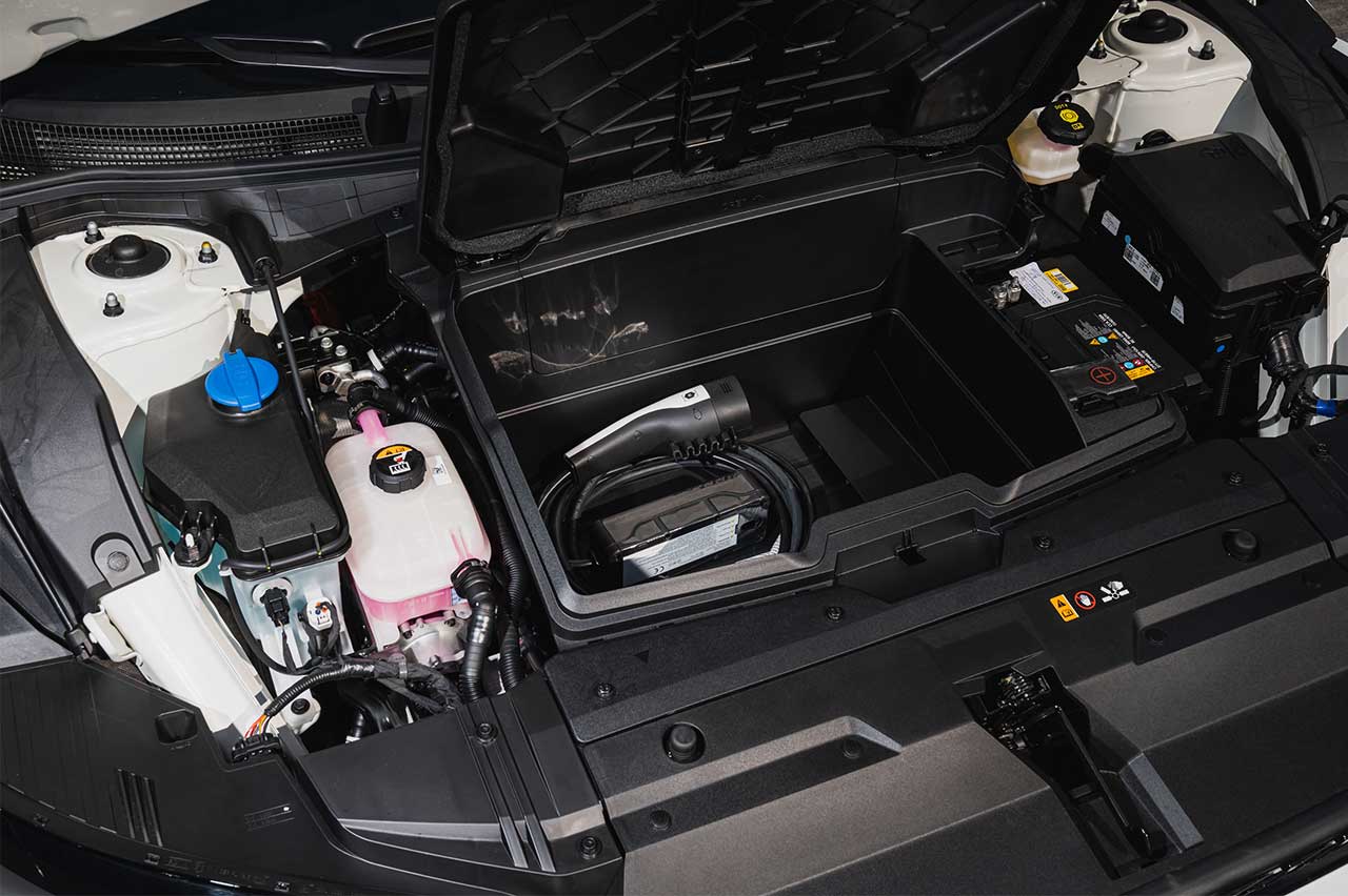 Además, se puede abatir la fila posterior de asientos si se necesita más espacio, y bajo el capó delantero también hay un pequeño hueco para guardar, por ejemplo, los cables de carga. Sinceramente, si a alguien no le basta con esta capacidad de almacenamiento lo mejor es que se busque, por ejemplo, un Sorento, que resulta mucho más capaz en este sentido.