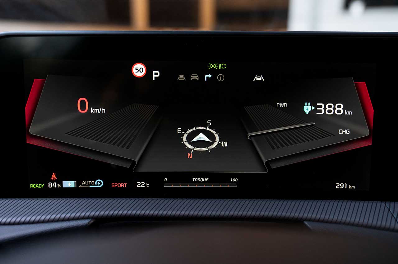 El salpicadero está comandado por dos pantallas de 12,3 pulgadas sin separación entre las mismas, al más puro estilo de la primera generación del sistema MBUX de Mercedes. Una aglutina los datos del cuadro de instrumentación, con diales digitales y cifras relativas al ordenador de a bordo; así como información sobre el consumo o la autonomía disponible.