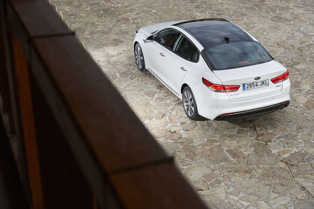 El nuevo Optima 2016 tiene una carrocería de cuatro puertas con una longitud de 4,85 metros, una anchura de 1,86 metros y una altura de 1,46 metros, es decir, es casi 2 cm más corto que un Ford Mondeo de última generación y unos 8 cm más largo que un (prueba) Volkswagen Passat. La distancia entre ejes se sitúa en los 2,805 metros, por lo que es ligeramente superior a la batalla del modelo al que sustituye (KIA Optima 2013) y según la marca, esto les ha permitido obtener un habitáculo más espacioso. El fabricante también asegura que el chasis es un 50% más rígido que el de su predecesor.