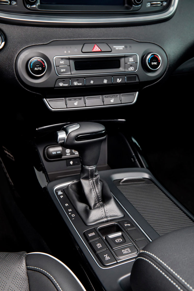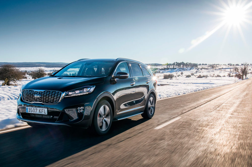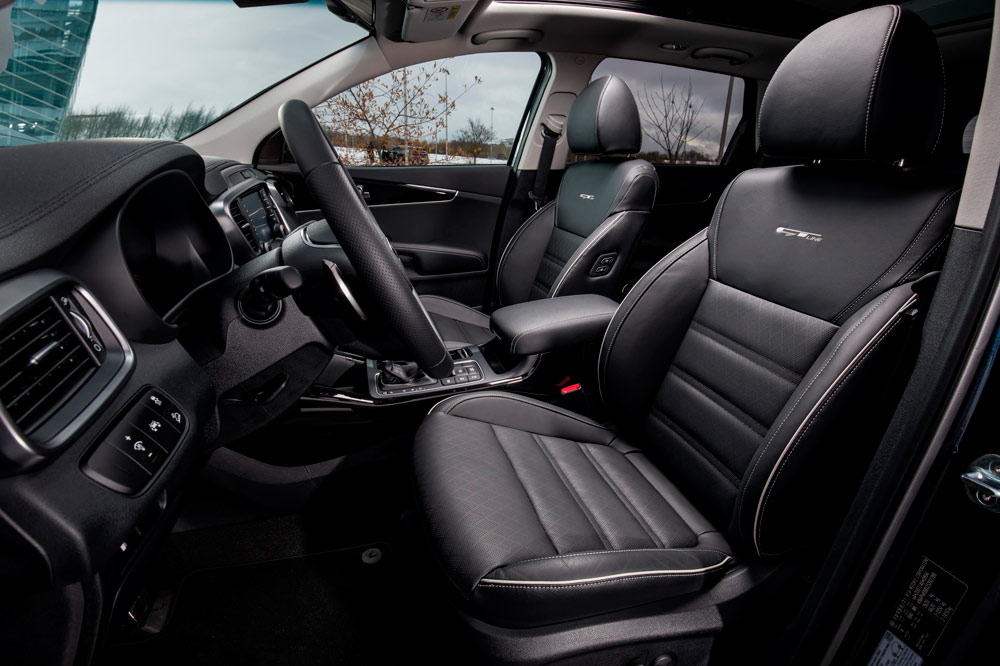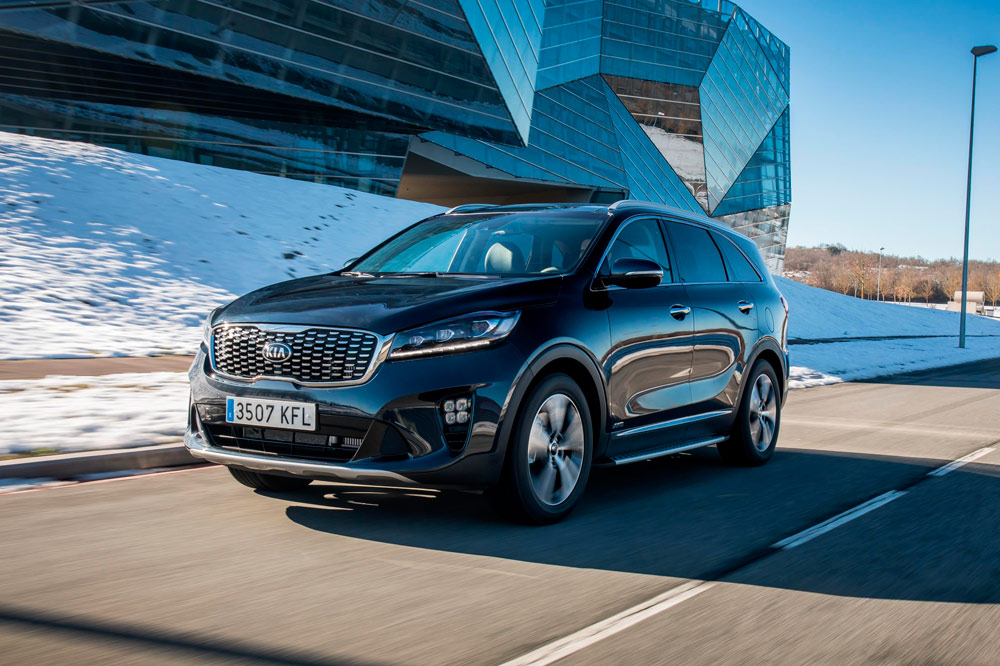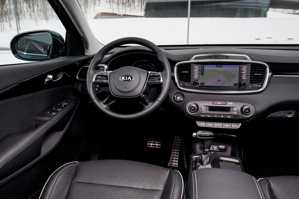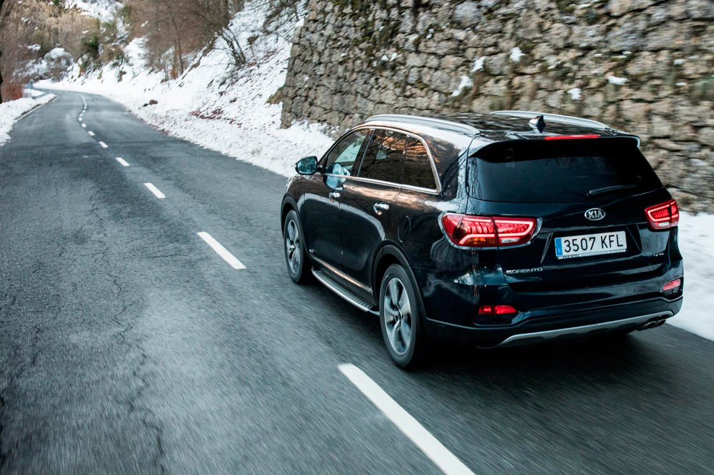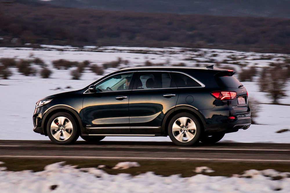La unidad de pruebas tiene la carrocería en color negro, algo que además de aportarle elegancia, potencia el contraste con los numerosos elementos cromados: parrilla, marcos de las ventanillas, barras del techo, reposapiés laterales, etc. También llaman la atención las protecciones de aluminio del frontal y de la zaga, en esta última dando forma a un difusor que aloja dos salidas de escape. Redondean el conjunto las enormes llantas, así como el alerón trasero o las luces antiniebla con el conocido formato de diodos cuadrados que popularizó el C’eed GT. No es un Sorento al uso, desde luego, y es algo que no cuesta ratificar una vez se cruza el umbral de la puerta.