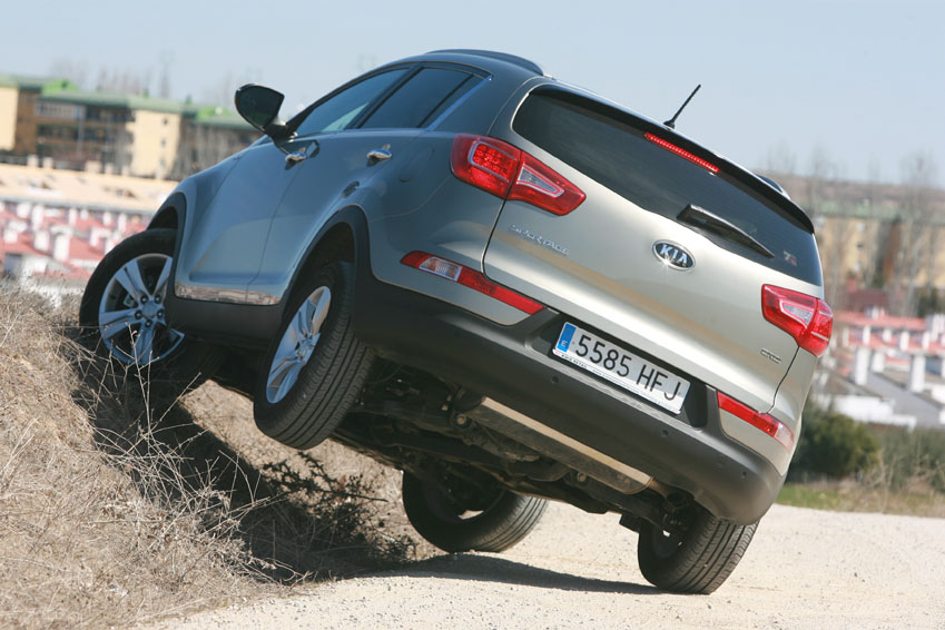 Como ya te anticipaba, el Kia Sportage Drive 2.0 CRDi 4x4 tiene dos ‘armas’ secretas para circular por el campo. Gracias a que es posible boquear el reparto de par entre ambos ejes, podrás avanzar por terrenos deslizantes siempre que evites cualquier articulación de la suspensión, pues no posee un recorrido muy amplio y resulta sencillo levantar una rueda del suelo. El segundo ‘gadget’ para conducción todoterreno es el denominado control de descensos. Con este sistema puedes paliar la falta de retención del motor provocada por la ausencia de reductora y así poder bajar las pendientes con la situación bajo control. ¡Ojo! Aunque sea capaz de desenvolverse en terrenos complicados, estos no son sus lugares favoritos pues la escasa altura libre unida a las débiles protecciones inferiores pueden provocar más de un dolor de cabeza.