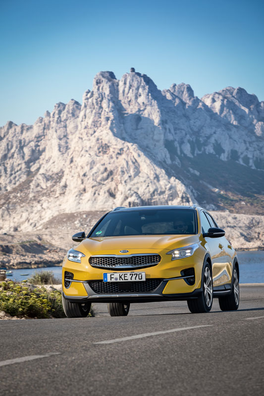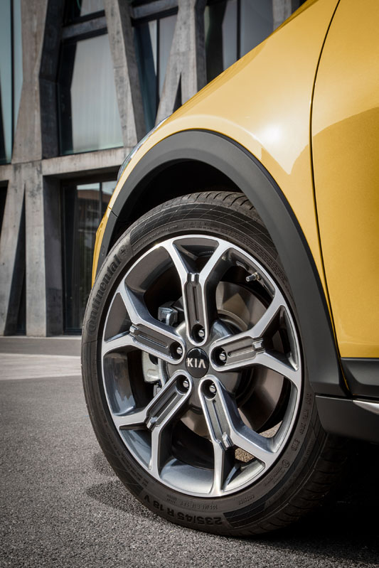 Todo lo que ven mis ojos, a excepción del la puerta delantera y el retrovisor, es nuevo. Destacaría los grupos ópticos delanteros, de acertado nuevo cuño, que al igual que los pilotos son full LED de serie desde el acabado de acceso; la parrilla de doble hoja con detalles distintivos en gris antracita, el capó, más alto y largo para conseguir un aspecto más agresivo y, sobre todo, el color Quantum Yellow, que es único de este modelo y que le sienta como anillo al dedo. No me olvido de las protecciones en plástico que recorren la parte inferior de la carrocería, incluidos los pasos de rueda, que consiguen un aspecto más off-road; y tampoco de las llantas de 16 y 18", también exclusivas del modelo de la prueba, el KIA Xceed.