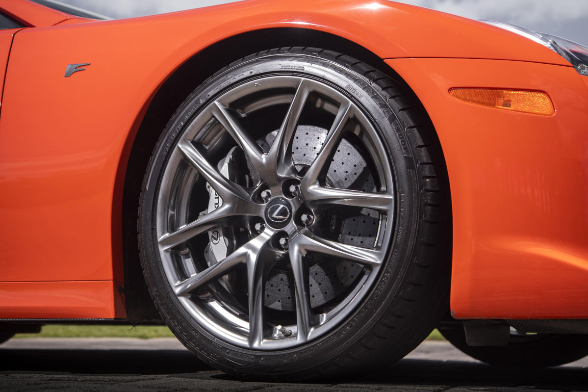llanta y freno del Lexus LFALa eficacia era su lema. Para ello, lo primero que se cuidó fue la báscula: 1.450 kg conseguidos mediante el empleo de materiales como el magnesio o el titanio en el motor y el plástico reforzado con fibra de carbono en una carrocería angulosa. Aquí destacan un difusor trasero, un spoiler que emerge a partir de los 80 km/h (aunque puedes desplegarlo de forma manual si lo tuyo es el postureo), llantas de 20”, frenos carbonocerámicos con pinzas de seis pistones y 12 centímetros de altura al suelo.