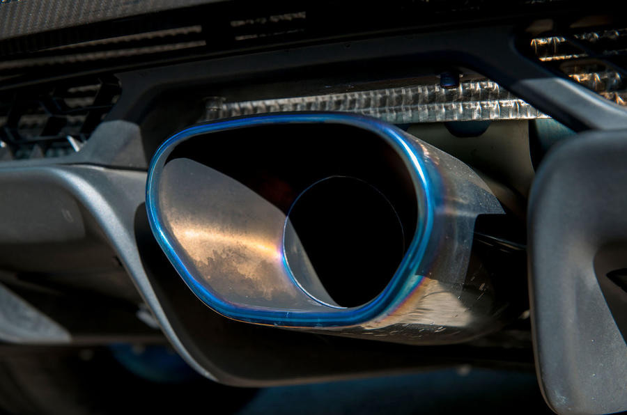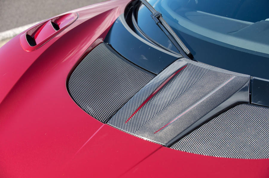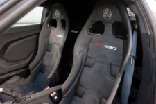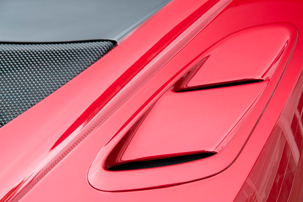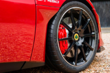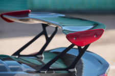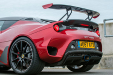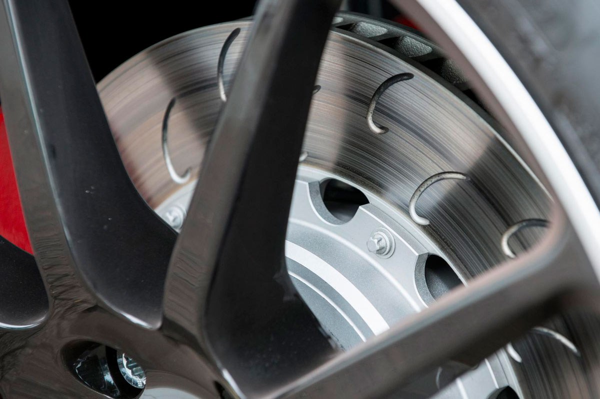 Pero no solo las sensaciones que comunica son similares a las de un coche de carreras, también lo es su imagen. Porta un enorme alerón, un gran difusor trasero, un sistema de escape de titanio, que consigue ahorrar en la báscula 10 kilogramos; y unas llantas de aleación ligera en aluminio que no son capaces de esconder los discos de freno ranurados y ventilados en J -370 mm miden los delanteros y 350 mm, los traseros- ni las pinzas AP Racing de cuatro pistones en color rojo. Asimismo, los apéndices aerodinámicos son múltiples y todos ellos, funcionales, como debe ser, para conseguir 250 kilogramos de carga a 305 km/h.