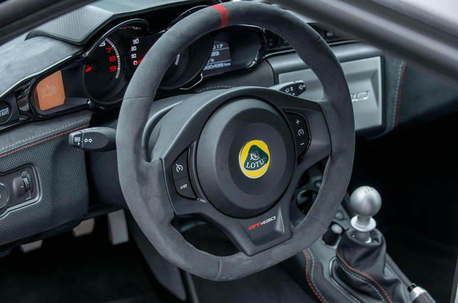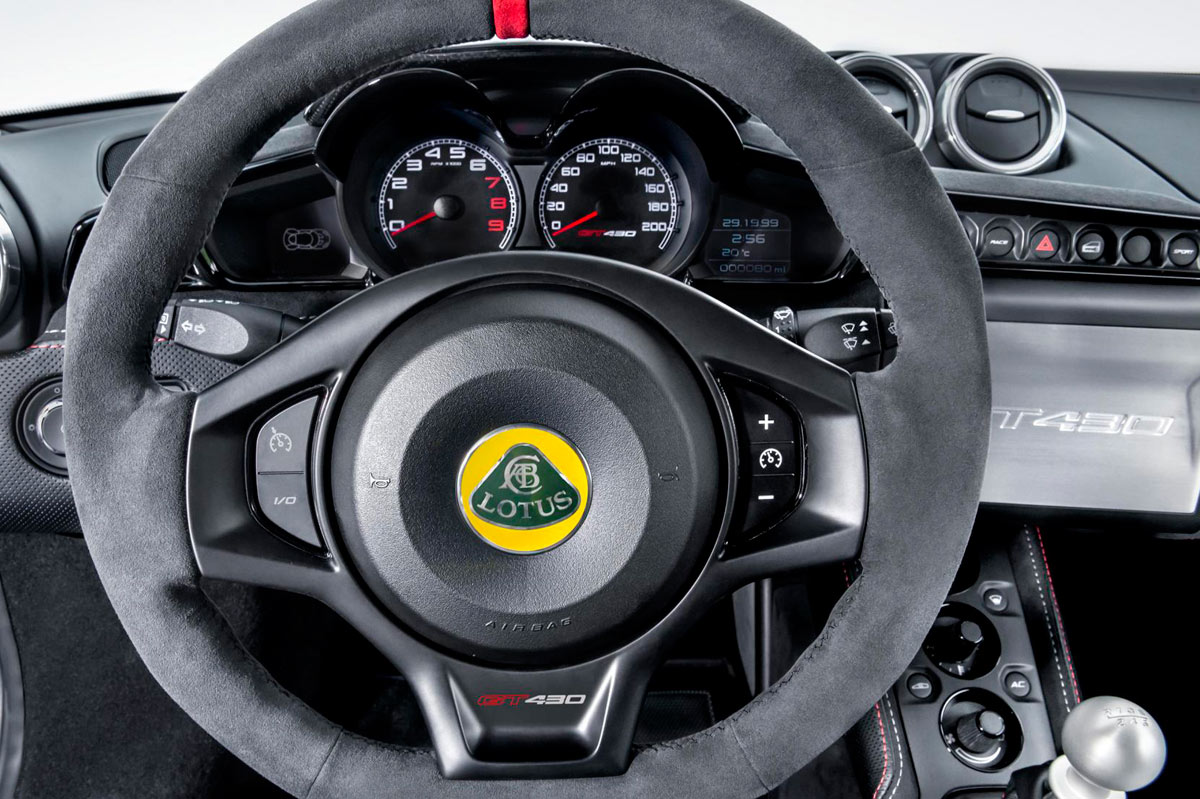 Continúo con al prueba del Lotus Evora GT430, ahora desgranando su dirección, que me sorprende por lo comunicativa que es. Además, es muy rápida y superprecisa. Todo se dirige desde un volante tapizado en Alcantara de diámetro contenido con la parte inferior levemente achatada -algo que nunca me ha convencido- y con una guía en el centro.