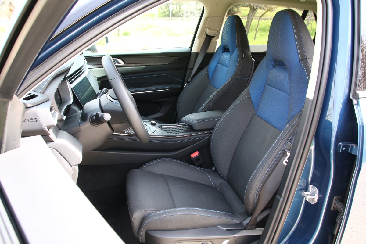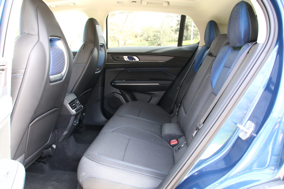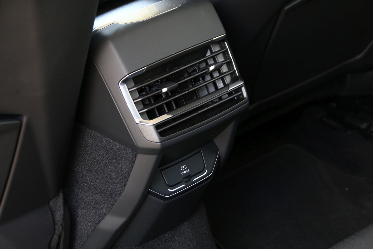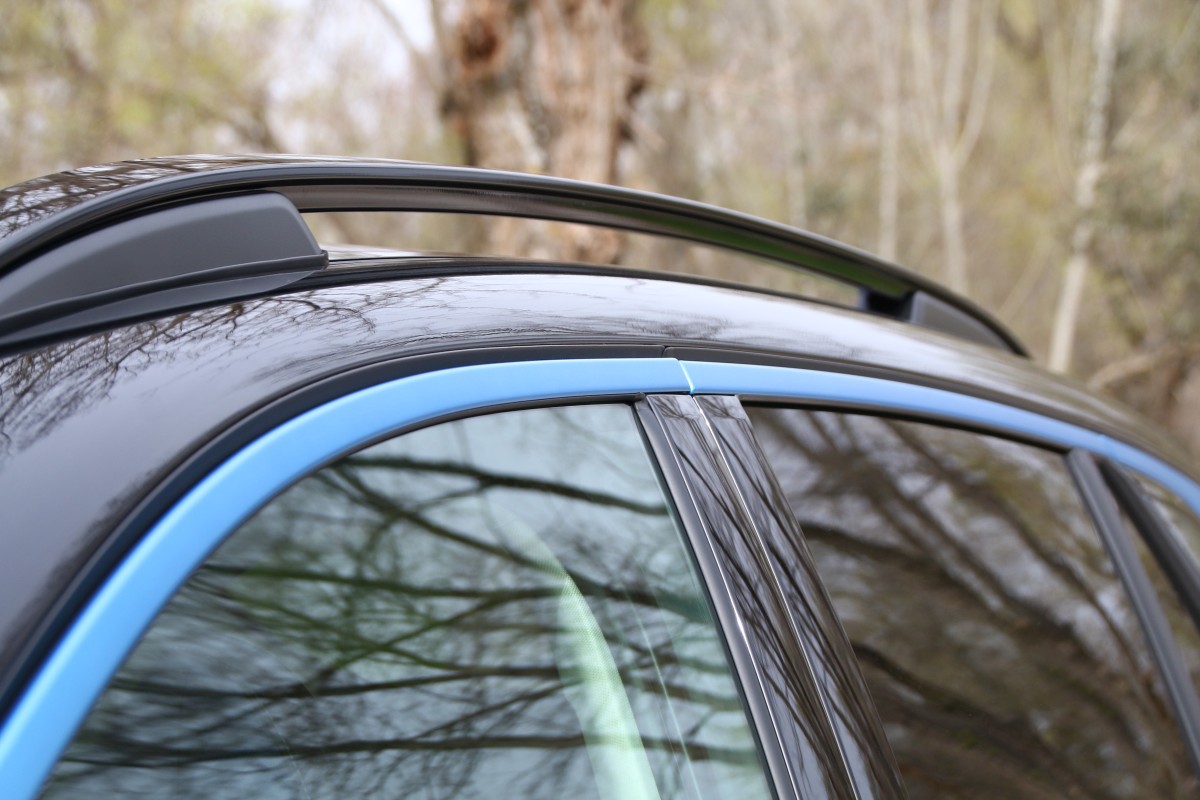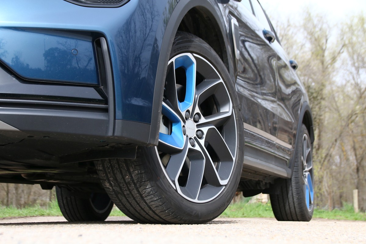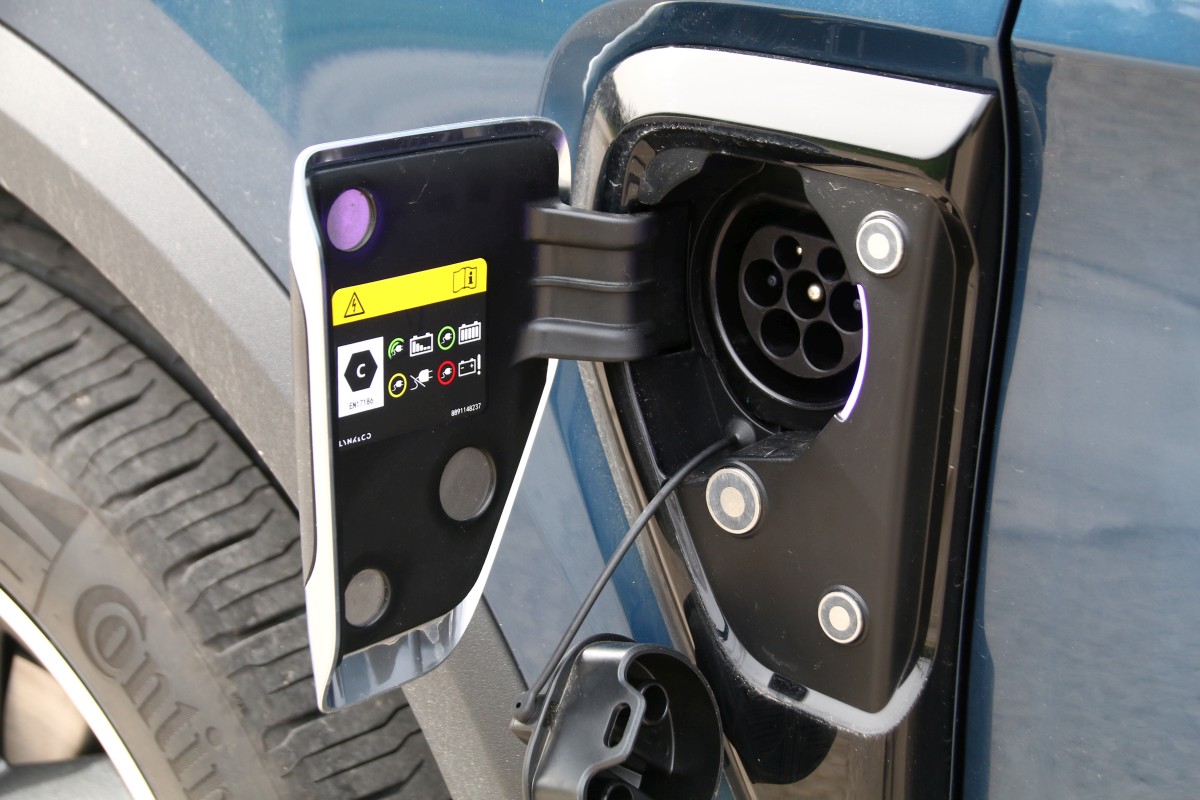 Destaca su frontal con una cara al estilo anfibio (a mí personalmente me recuerda al del KIA Niro [prueba]) gracias a las prominentes luces diurnas situadas en los extremos, perfilando un capó semicircular, y a la gigantesca parrilla que conecta los grupos ópticos principales con tecnología Full LED. De lado tiene unas formas más clásicas, con unas llantas de 20 pulgadas en gris con motivos azules (tono que también está presente en los marcos de las ventanillas y la parrilla), barras de techo o cristales tintados. En el paso de rueda izquierdo se sitúa la toma de carga que solo se puede abrir desde el interior pulsando un botón bastante tiempo o mediante la llave si pulsamos cinco veces el comando de apertura.