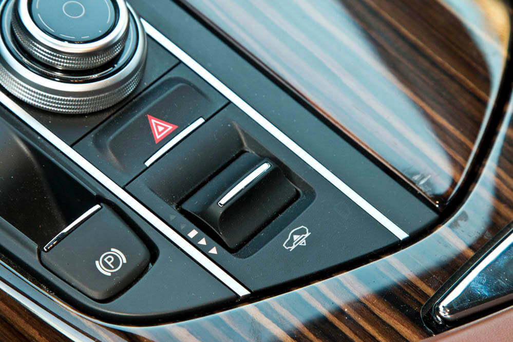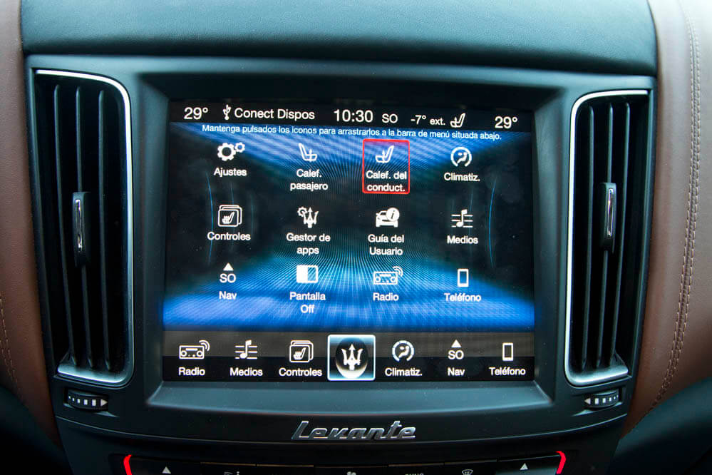 El primer vistazo al interior me revela un salpicadero parecido al del Ghibli pero con una mayor sensación de calidad, al menos de primeras. La verdad es que te sientes bien, todo parece estar en su lugar y, aunque no soy fan de aglutinar todos los mandos, climatización incluida, en la pantalla táctil, debo decir que su funcionamiento es intuitivo y te haces a todo con rapidez. Lo que más me gusta del interior, ¡cómo no! Es la calidad del cuero: excelente; se nota que Maserati trabaja con grandes proveedores en la materia y la verdad es que entre el asiento deportivo, cómodo y con buen agarre, y el tacto del cuero, rápidamente te sientes a gusto.