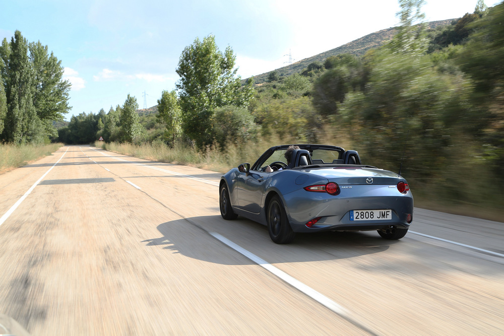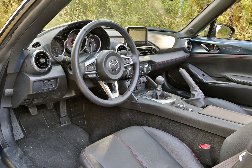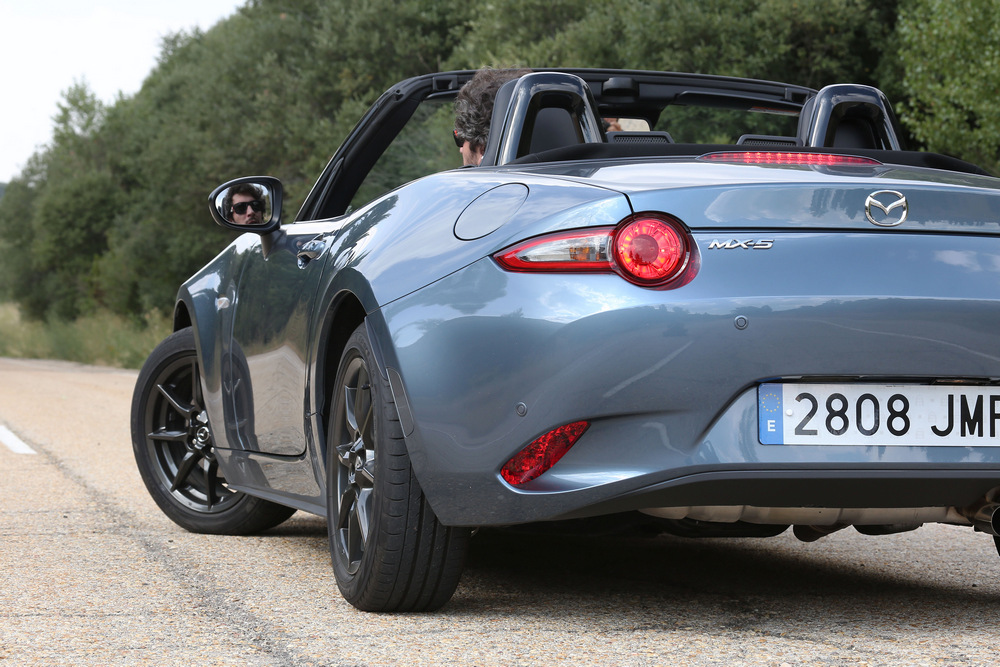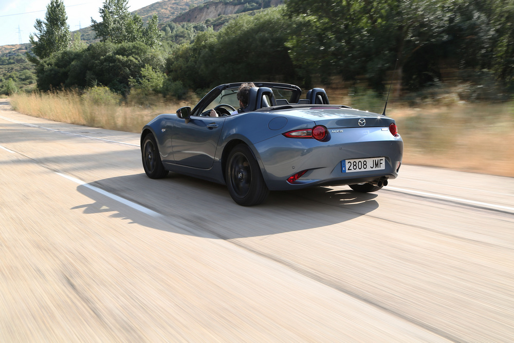 Zona roja que, por cierto, parece no llegar nunca, pues el corte de inyección se produce cuando casi hemos alcanzado las 7.750 vueltas. Y se siente francamente cómodo girando a altas revoluciones, lo que unido a su sonido, al tacto de la caja de cambios y a la agilidad del conjunto, te invita a aprovechar siempre que puedas todas sus capacidades. Lo bueno es que en este caso seguramente no llegues ni a superar el límite de velocidad de la vía: es un deportivo que se puede disfrutar conduciendo por la calle sin miedo a saltarte las normas (en el sentido de que con un coche más potente no podrás sacar partido a todo el rendimiento del motor durante tanto tiempo como en este MX-5).