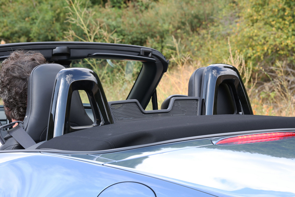 Pero eso es fácil de solucionar: basta con accionar la palanca (imagen) que ancla la capota al marco del parabrisas, empujar el techo hasta su posición de plegado (imagen) y ya puedes disfrutar de tanta altura como desees. Capotar y descapotar el Mazda MX-5 ND puede hacerse tanto desde el exterior como sentado en el interior, aunque en este caso tendrás que forzar un poco la postura para poder alcanzarlo. En este caso, tampoco es necesario estar detenido: puedes hacerlo en movimiento a velocidades contenidas sin que suponga ningún problema.