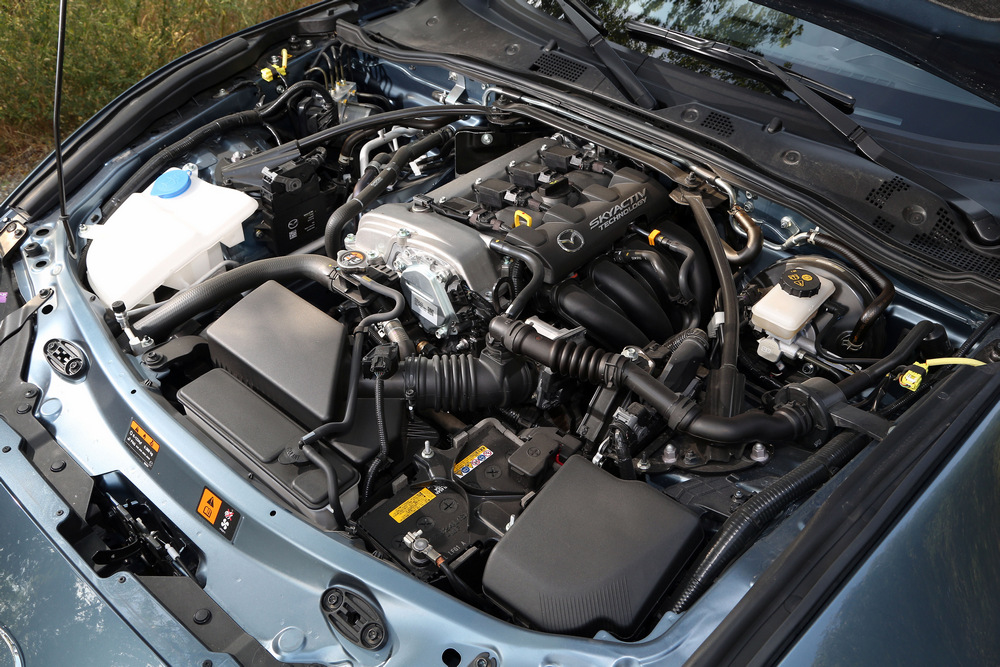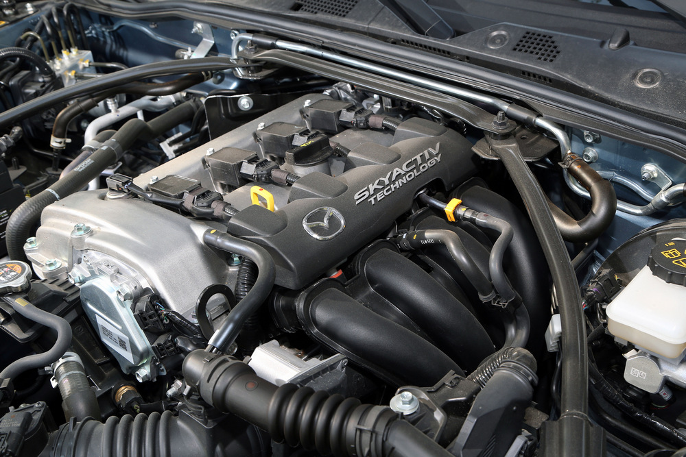 La cuarta generación del Mazda MX-5 mantiene la arquitectura de sus antecesores, con el motor ubicado en posición longitudinal central delantera enviando su potencia al eje trasero. Gracias a que ahora el propulsor (imagen) va situado ligeramente más retrasado y a que han empleado aluminio en algunos componentes (desde elementos de las suspensiones hasta el capó o la tapa del maletero son de aluminio), han mejorado el centro de gravedad, lo que afecta directamente a la agilidad para realizar cambios de dirección. La rigidez estructural es superior a la de sus antecesores gracias, entre otras cosas, a elementos como el refuerzo que une la caja de cambios con el diferencial trasero.