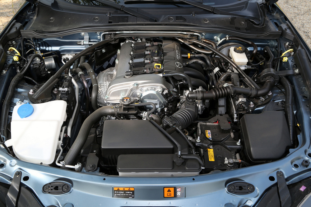 La cuarta generación del Mazda MX-5 mantiene la arquitectura de sus antecesores, con el motor ubicado en posición longitudinal central delantera enviando su potencia al eje trasero. Gracias a que ahora el propulsor (imagen) va situado ligeramente más retrasado y a que han empleado aluminio en algunos componentes (desde elementos de las suspensiones hasta el capó o la tapa del maletero son de aluminio), han mejorado el centro de gravedad, lo que afecta directamente a la agilidad para realizar cambios de dirección. La rigidez estructural es superior a la de sus antecesores gracias, entre otras cosas, a elementos como el refuerzo que une la caja de cambios con el diferencial trasero.