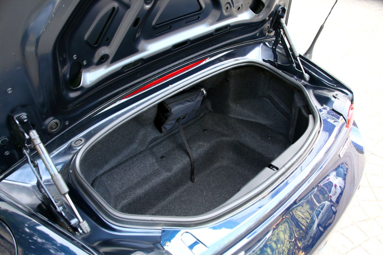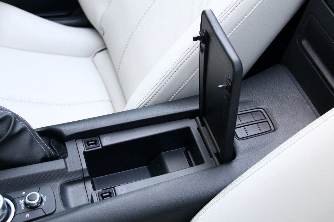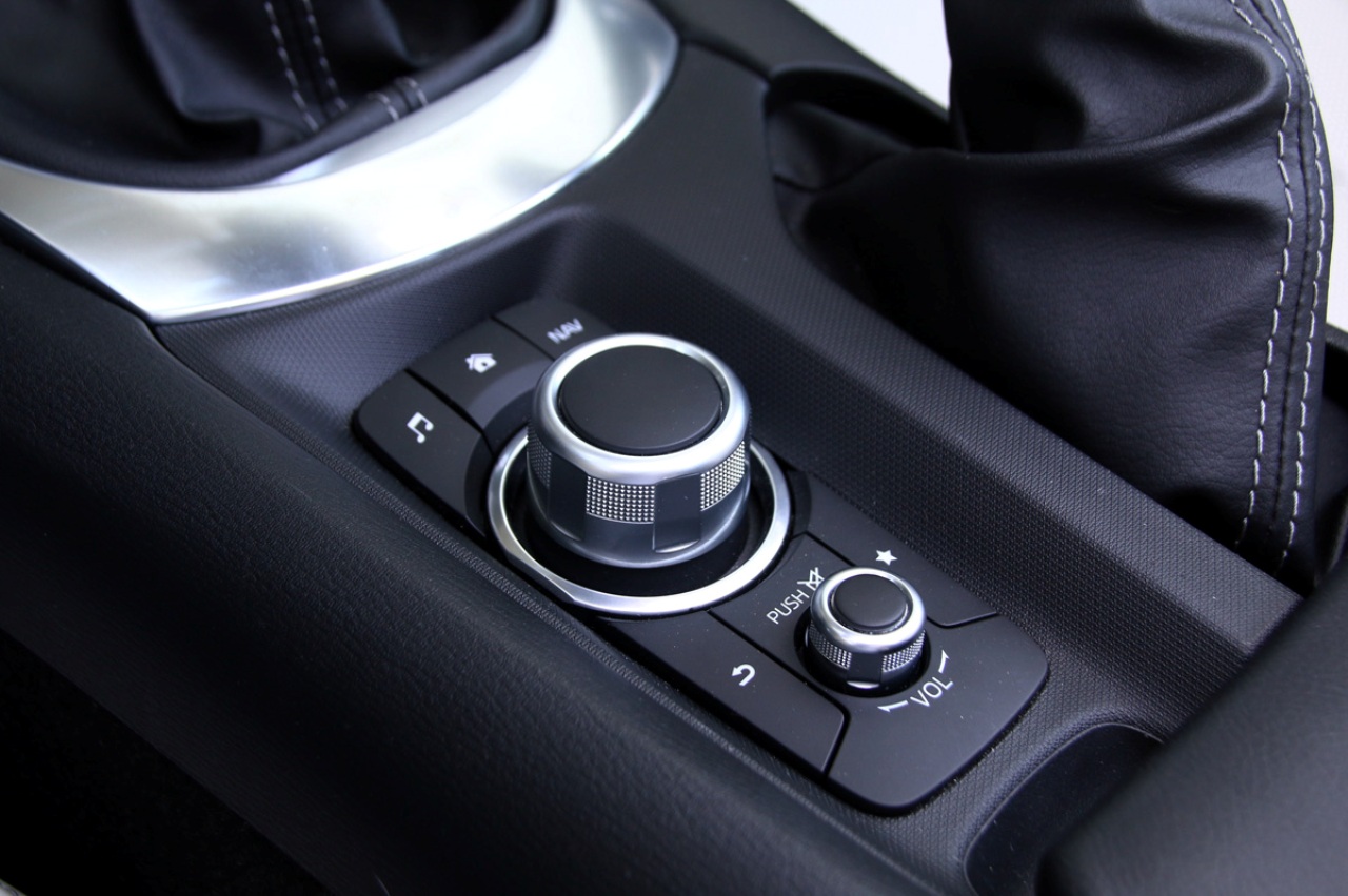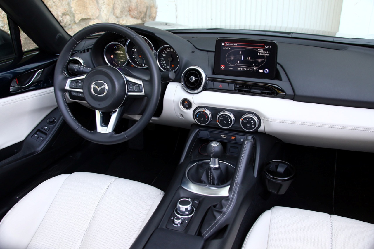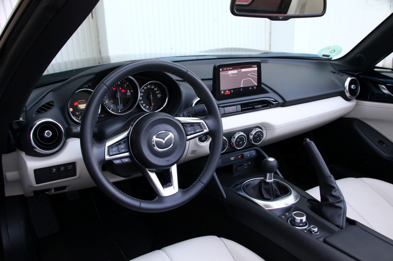 Llave en mano, me dispongo a tener una segunda cita con el MX-5. Abro la puerta y accedo a un interior más pequeño de lo que recordaba. Lo primero es buscar algún sitio donde dejar la llave, la cartera y el móvil, que ahora son más grandes de lo que eran hace algo más de un lustro. Apenas encuentro un pequeño compartimento bajo los mandos del climatizador, una guantera detrás del freno de mano y un lugar, por suerte de mayor tamaño, entre los asientos.