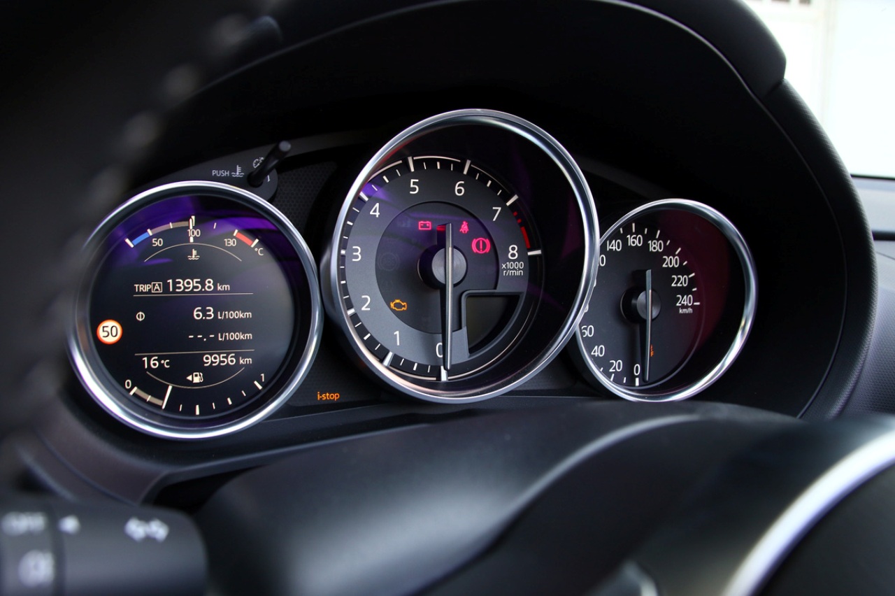 Tras descargarme de cualquier incomodidad, me dispongo a analizar el habitáculo. Cuero, molduras metálicas o en acabado brillante y la mayoría de sus paneles acolchados. Buenas terminaciones en general que le dan un aspecto más premium al MX-5. No lo son tanto los mandos del climatizador, que solo se puede regular en una zona, pero lo compensa con la nueva pantalla ubicada en la esfera izquierda del cuadro de instrumentos, con gráficos mejorados y a color. Ahora ofrece más información y, tras su actualización, presentan un estilo más logrado y, sobre todo, contemporáneo.