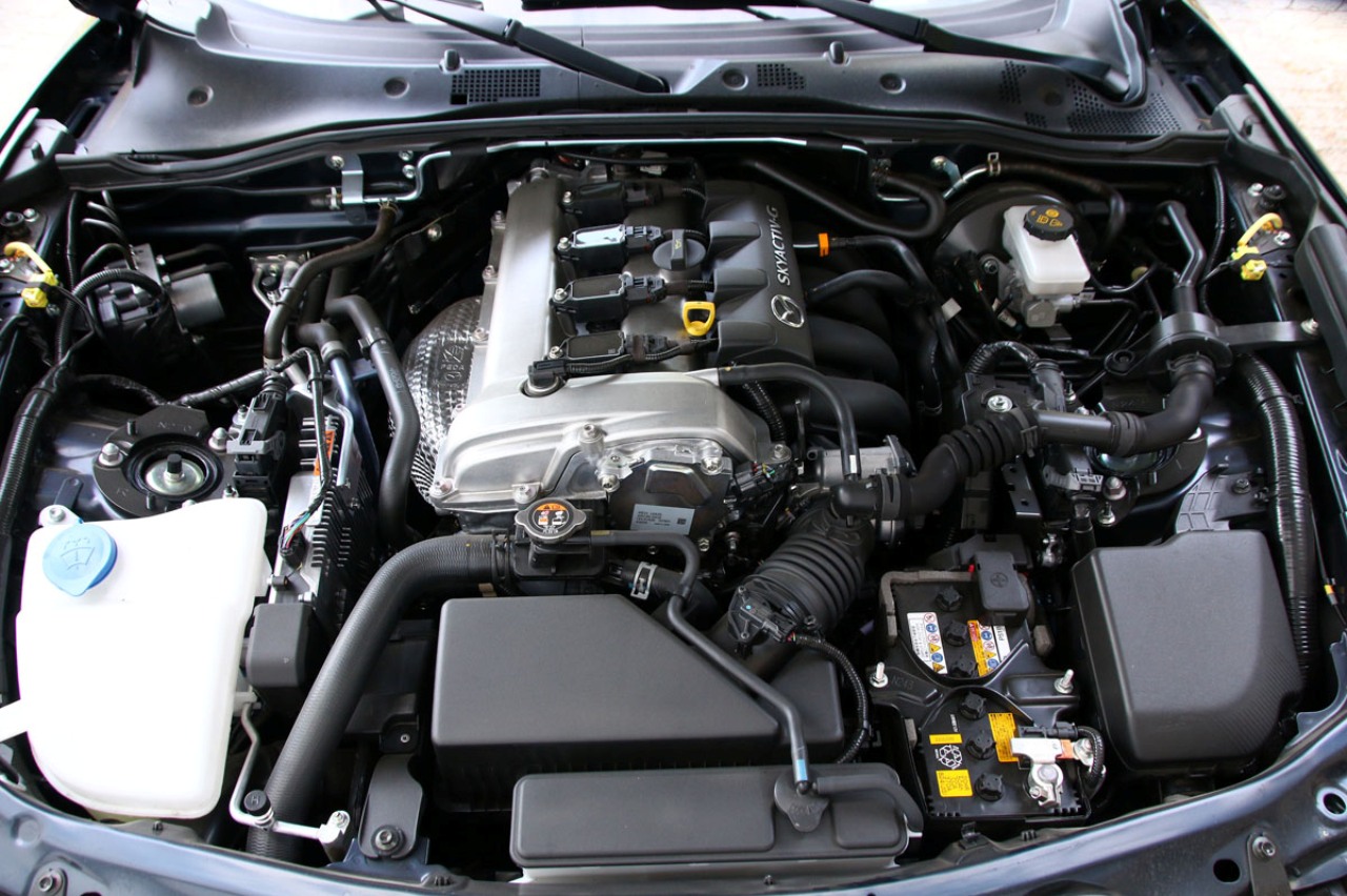 Esta configuración permite al nuevo MX-5 2.0 SKYACTIV-G 184 CV con cambio manual de seis velocidades ser más rápido que la versión anterior. Concretamente, es 0,8 segundos más rápido en el 0 a 100 km/h (6,5 segundos), y ahora alcanza 5 km/h más de velocidad máxima (219 km/h). Además, para reducir el consumo y las emisiones, el MX-5 2.0 SKYACTIV-G cuenta con el sistema de corte de ralentí i-stop y una versión aligerada del freno regenerativo i-ELOOP.