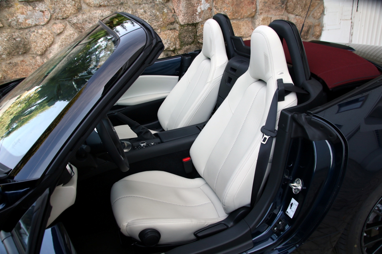 El techo de lona -un factor clave en la decisión de compra- que equipa el MX-5 de la prueba se puede plegar de forma manual en cuestión de segundos. Entre los asientos hay un difusor de aire que permite derivar parte del viento que accede a la cabina y mejorar el confort a bordo.