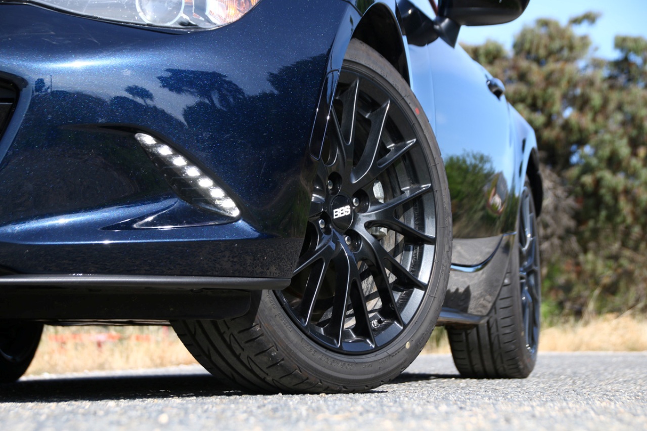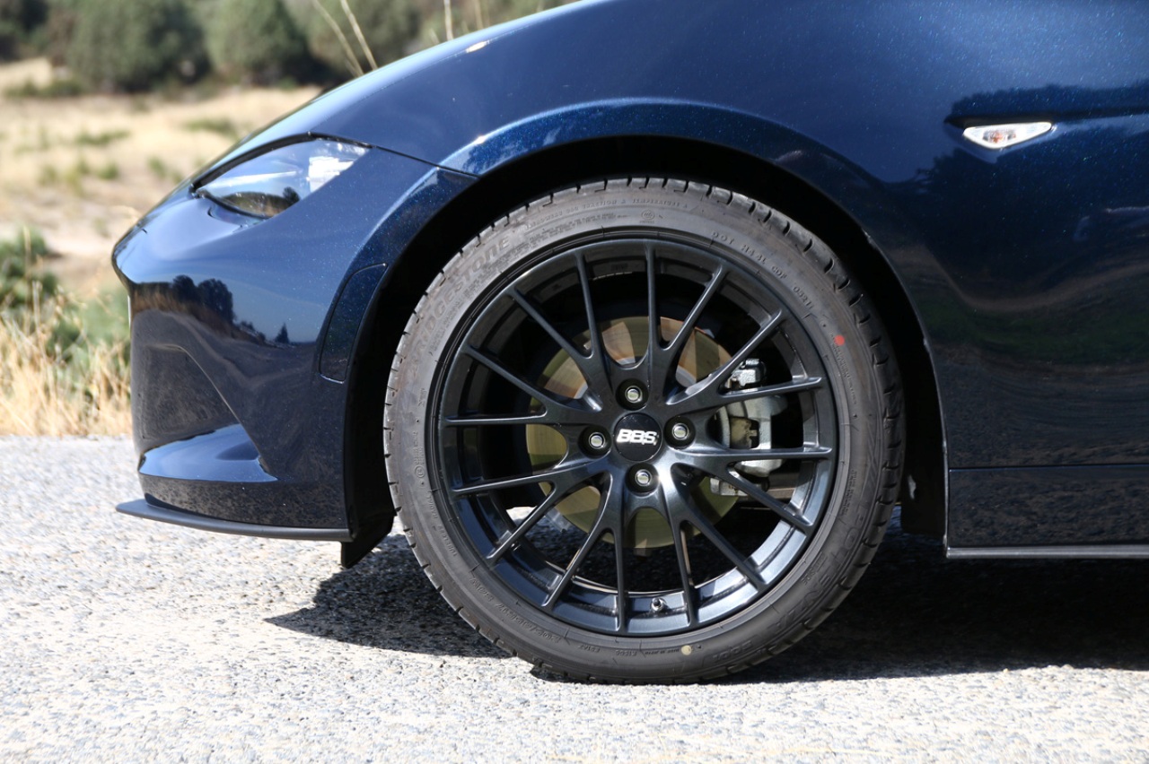 Calzado con unos neumáticos Bridgestone Potenza de 17 pulgadas, la capacidad de tracción y el agarre en curva es de una precisión milimétrica. Buena culpa de ello la tiene la puesta a punto dinámica del Miata, su peso contenido (apenas 1.025 kilos en orden de marcha), y un centro de gravedad extremadamente bajo. Esto permite que, al encarar una curva, baste con un toque al freno para meter el coche al vértice y volver a acelerar al salir.