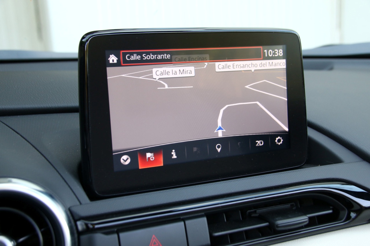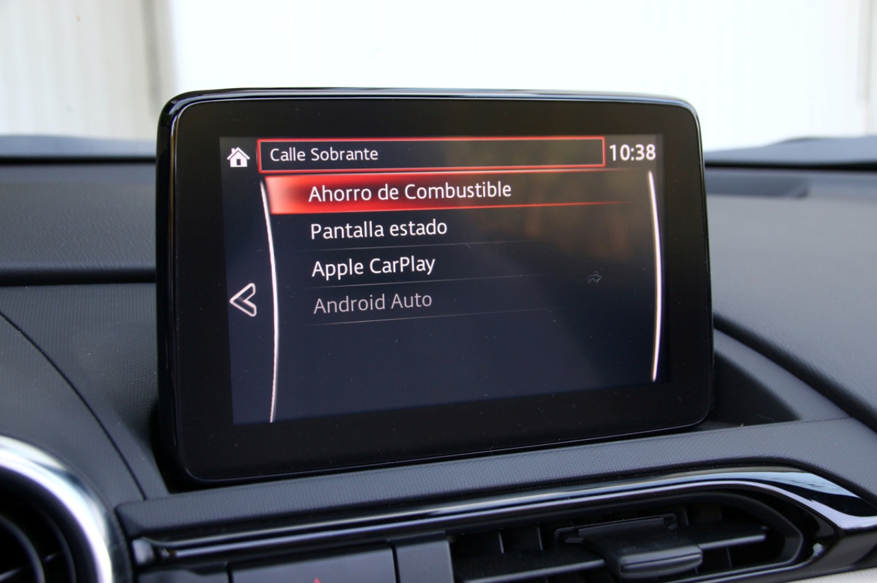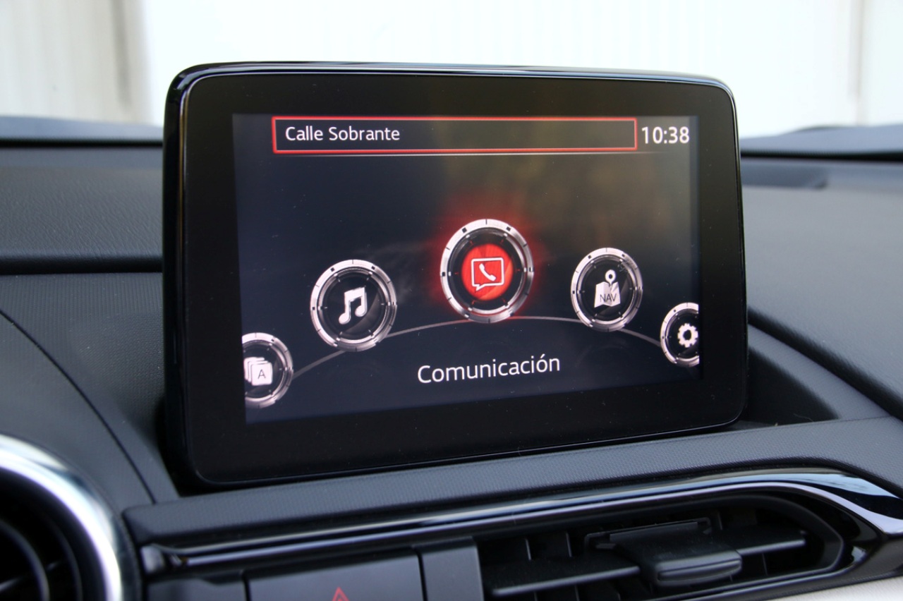 Acostumbrado cada vez más a pantallas táctiles de gran tamaño, el sistema de infoentretenimiento MZD Connect del Mazda MX-5 2.0 SKYACTIV-G 184 CV Blue&Red Edition es de apenas 7 pulgadas, pero ofrece una respuesta bastante fluida, especialmente con los mandos físicos integrados en la consola inferior. Me gusta que no esté integrada y que, a pesar de presentar un estilo flotante, no obstaculiza el campo de visión. Además, incluye navegador, compatibilidad con Android Auto y Apple CarPlay, Bluetooth y radio digital (DAB).