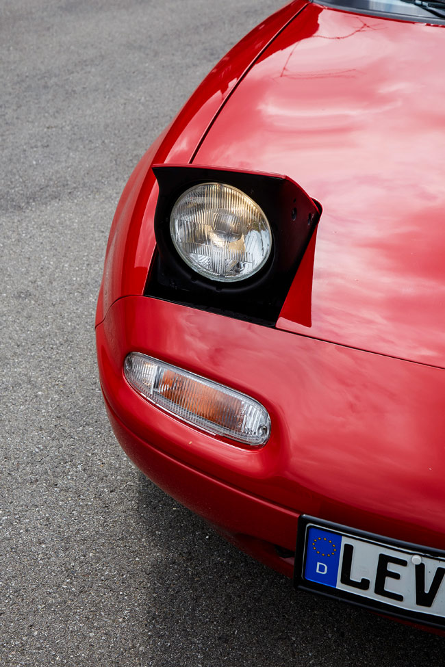 Así le enseñaba las virtudes de su Mazda MX-5 de primera generación -código Na-, a sus ligues, un buen amigo mío. Y es que esos faros escamoteables causaban furor, le sentaban francamente bien, y se hacían protagonistas de su estética, muy llamativa, junto con su "boca", la amplia toma de aire de la defensa. Gran acierto de última hora esos faros, pues el primer prototipo no los tenía, y posteriormente desaparecieron del mercado por diversas razones, como que no son aerodinámicos, son relativamente caros, no pueden dar ráfagas sin antes abrirse...