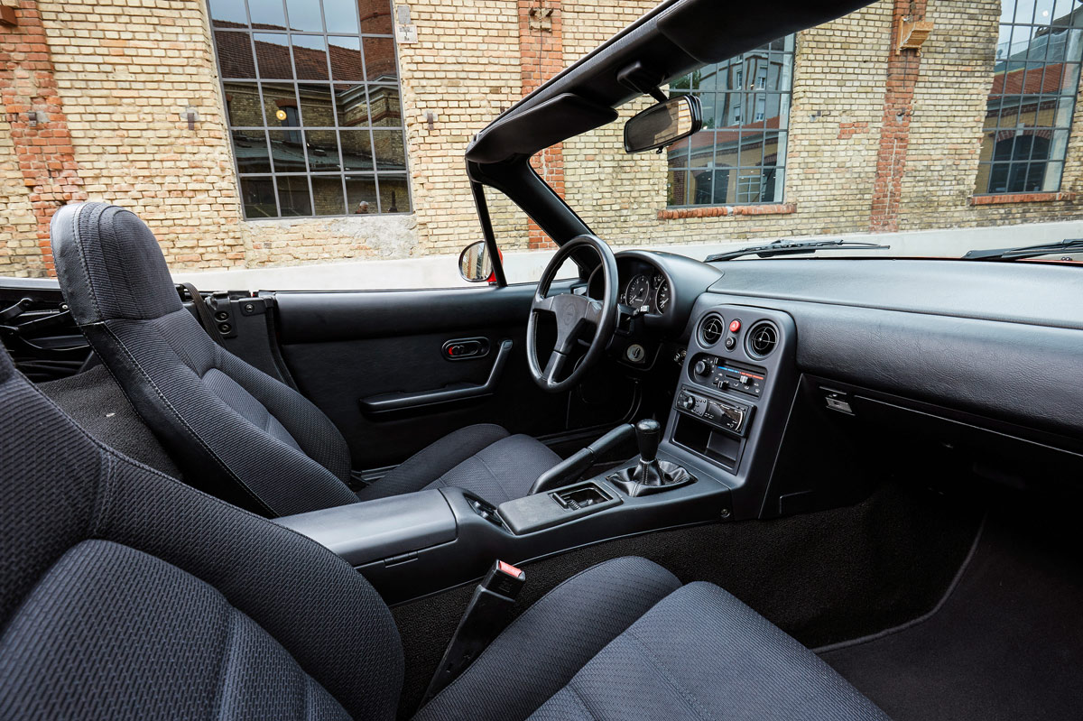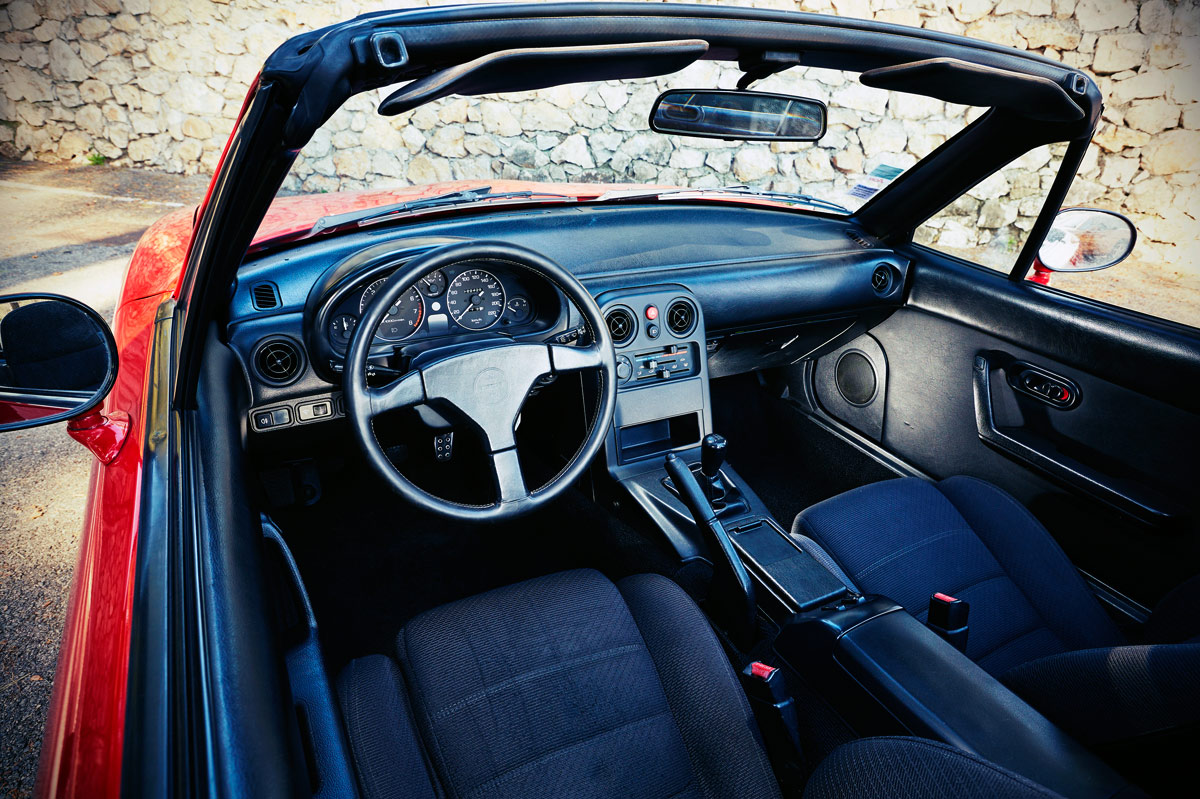 Arrancamos. En los años 90 no había ni biplazas ni muchos cabrios -la llegada del Peugeot 208 CC, años más tarde, duplicó el mercado español de cabrios- con lo que el MX-5 podría haber sido un éxito solo por lo figurín que es, puede llevarte con distinción y elegancia a todas partes. La capota es manual, de tela -con una demasiado simple luneta trasera de plástico-, y puede accionarse desde el asiento. Pero el Miata no se quedó ahí.