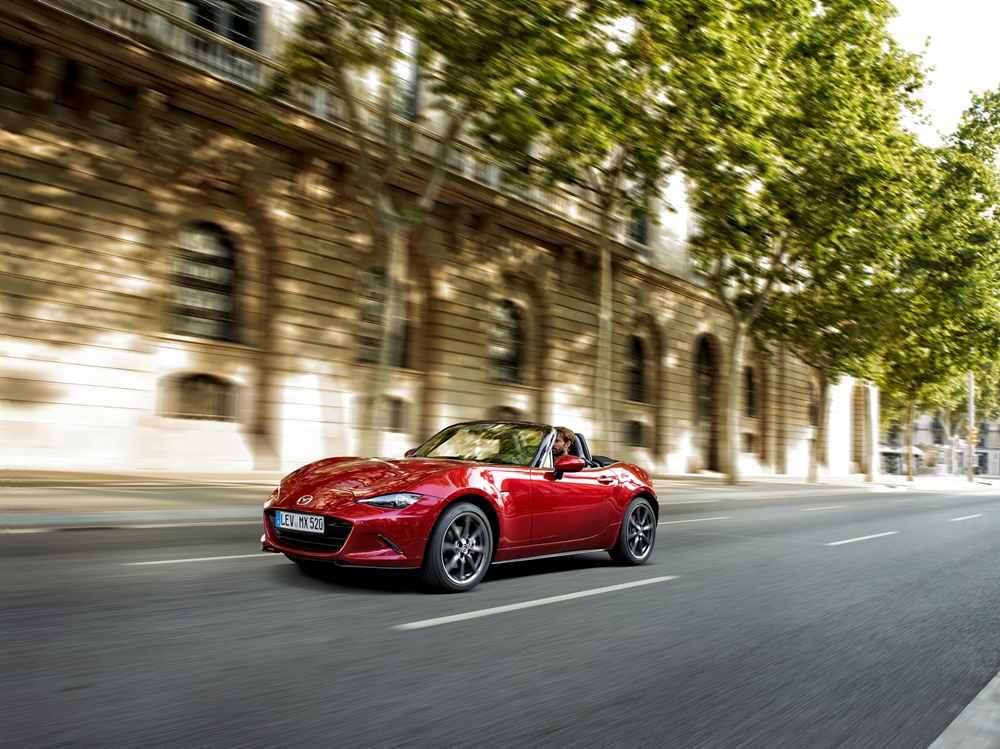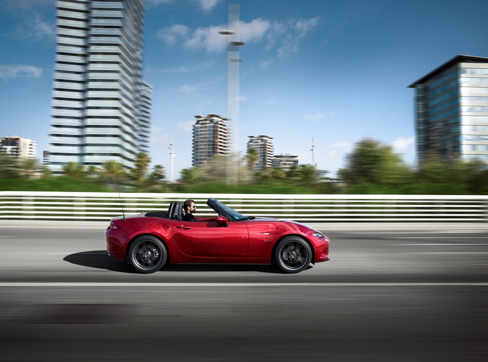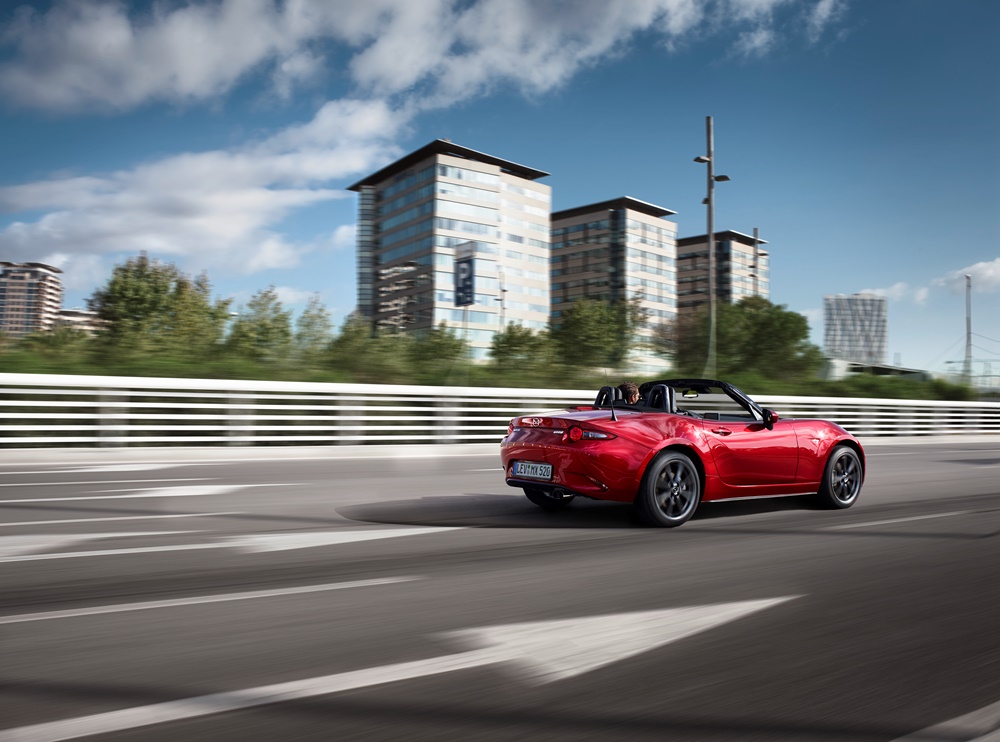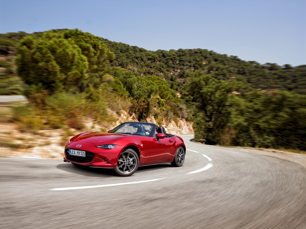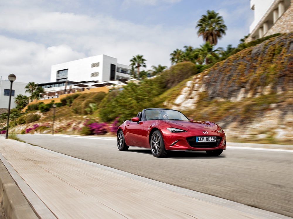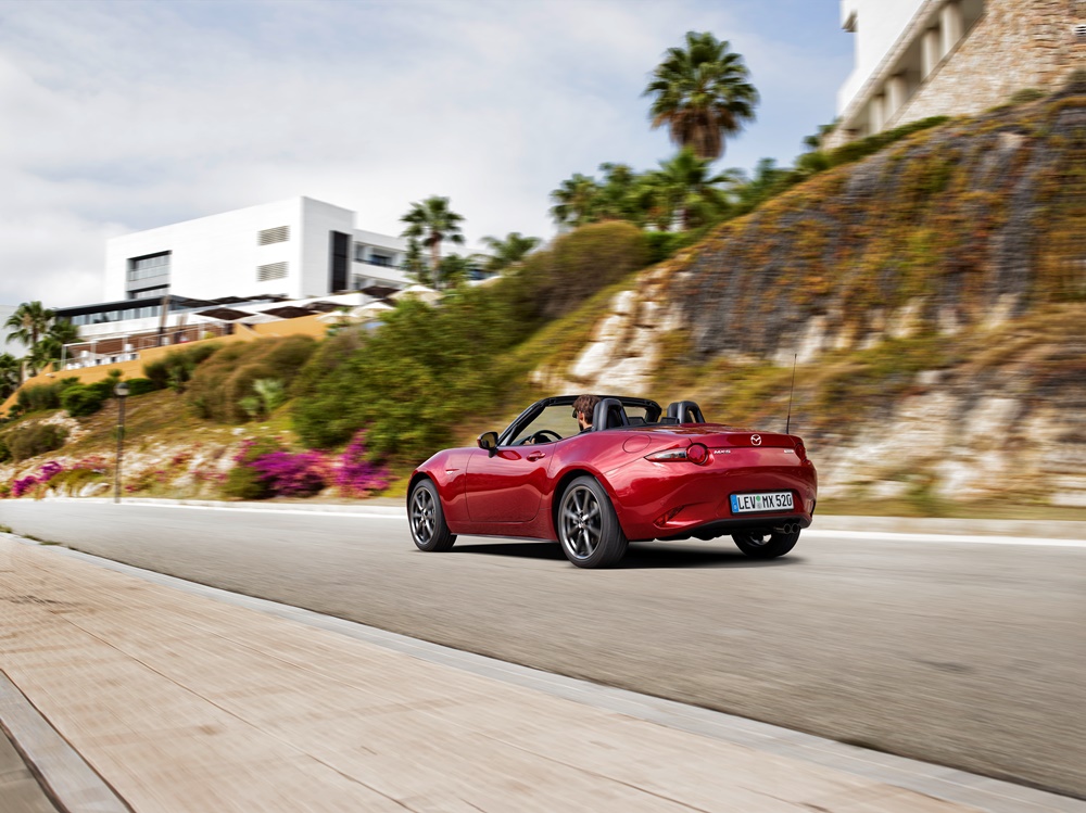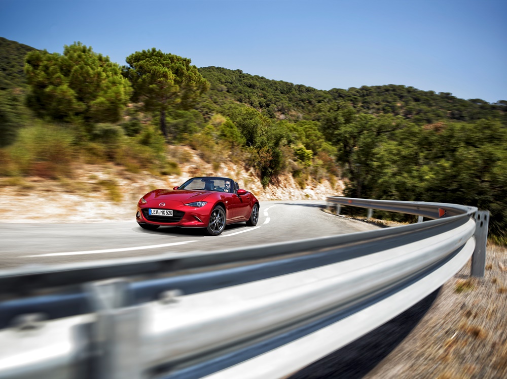 Esta combinación de factores, unidos a la transmisión manual, la propulsión trasera y el diferencial autoblocante (solo disponible en el motor de 2,0 litros) hacen del MX-5 una precisa herramienta de conducción. Su paso por curva es muy rápido, la suspensión se mantiene firme para evitar balanceos y su exquisito reparto de pesos hace que la trasera no se salga de la línea. Estable y rápido en los tramos de curvas, donde las recuperaciones en marchas largas a partir de 2.500 rpm se llevan a cabo de forma efectiva. El sistema de frenos sin ‘florituras’ presenta discos ventilados delanteros y macizos traseros de 280 mm en el 2.0, mientras que en el 1,5 litros son de 258 y 255 mm respectivamente.