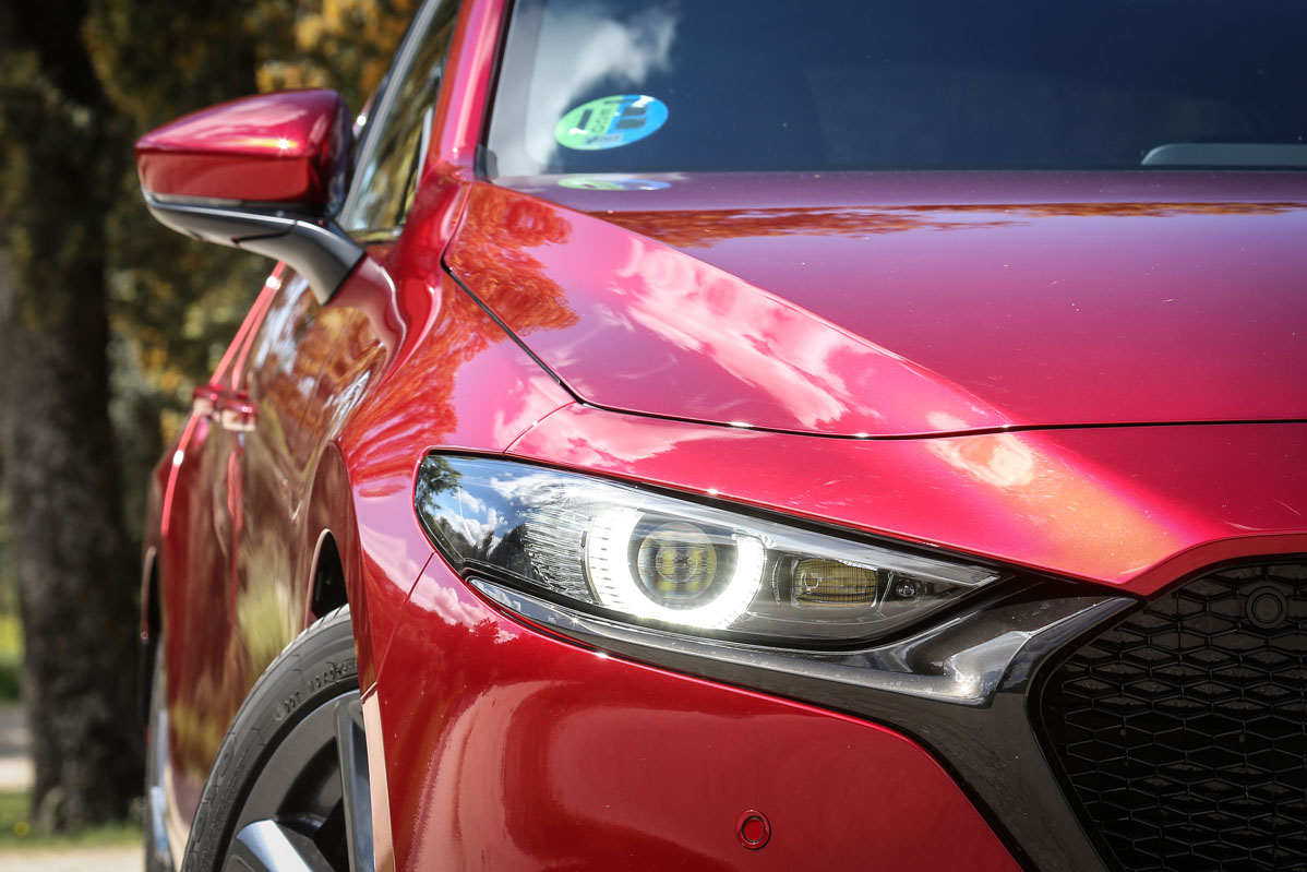 faro del Mazda3 2019A nivel estético, y dejando a un lado las opiniones personales de unos y otros, resulta imposible negarle a nuestros colegas japos el valor mostrado a la hora de darle forma a su nuevo rival para uno de los segmentos más competidos del mercado: a pesar de que la tendencia actual impone unas formas de lo más agresivas, en Mazda han preferido crear un conjunto redondeado que, además de resultar insultantemente armónico, sirve para poder presumir de una personalidad muy marcada que no deja a nadie indiferente. Y menos aún en el color 'Soul Red Crystal' que cubre los paneles de la carrocería de esta unidad de pruebas.