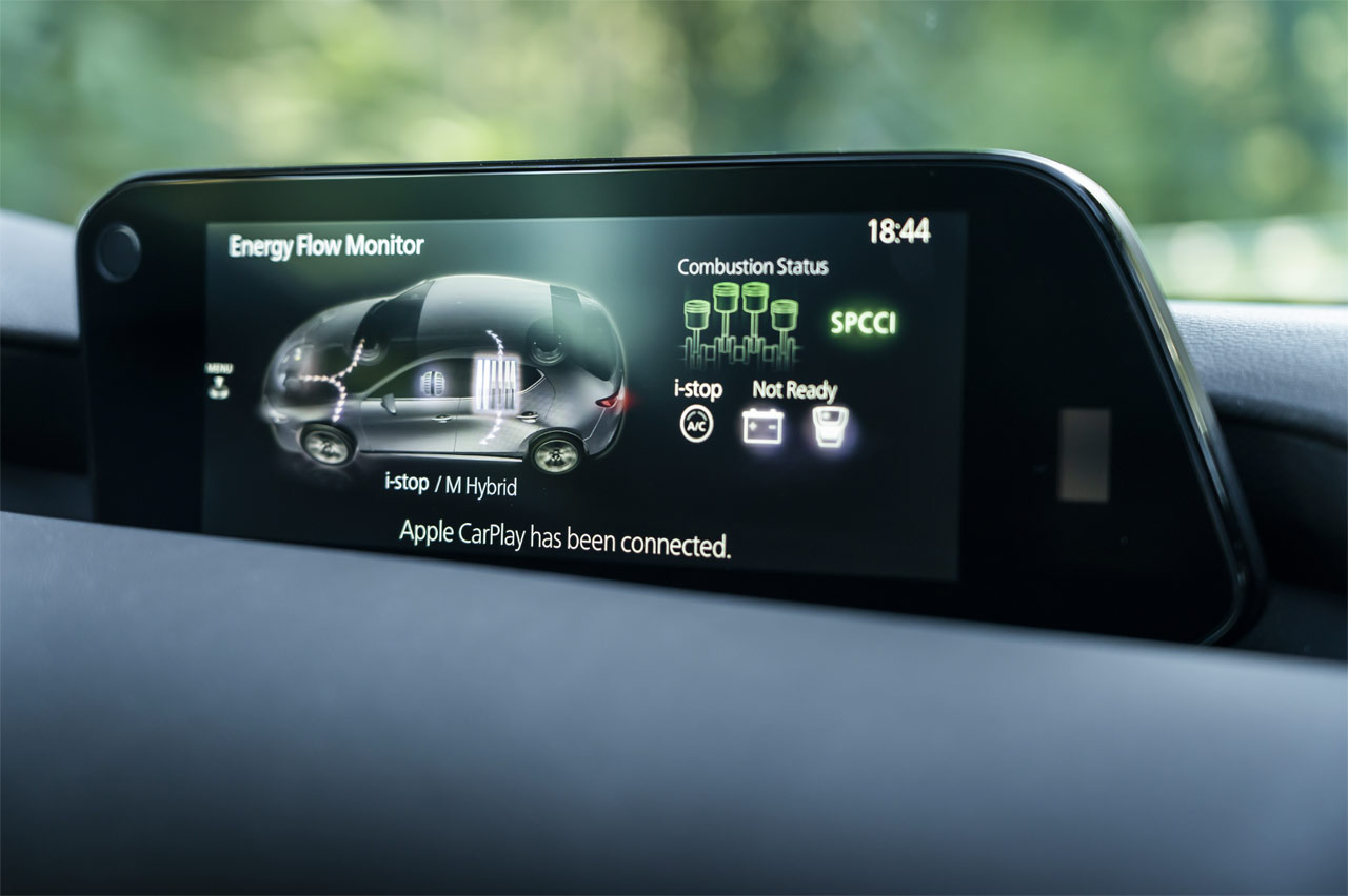 El sistema SPCCI consigue que la la combustión se consiga mediante encendido por compresión controlado por chispa, normalmente casi siempre, excepto a ralentí o en aceleraciones muy fuertes a determinado rango de revoluciones. Por ello, este tipo de funcionamiento se suele dar en un 90-95% del tiempo en el que se circula. El cambio de encendido por chispa a compresión o viceversa es imperceptible en sensaciones o al oído, por lo que solo soy consciente de ello si miro en el menú del sistema de infoentretenimiento el 'monitor de flujo de energía'.
