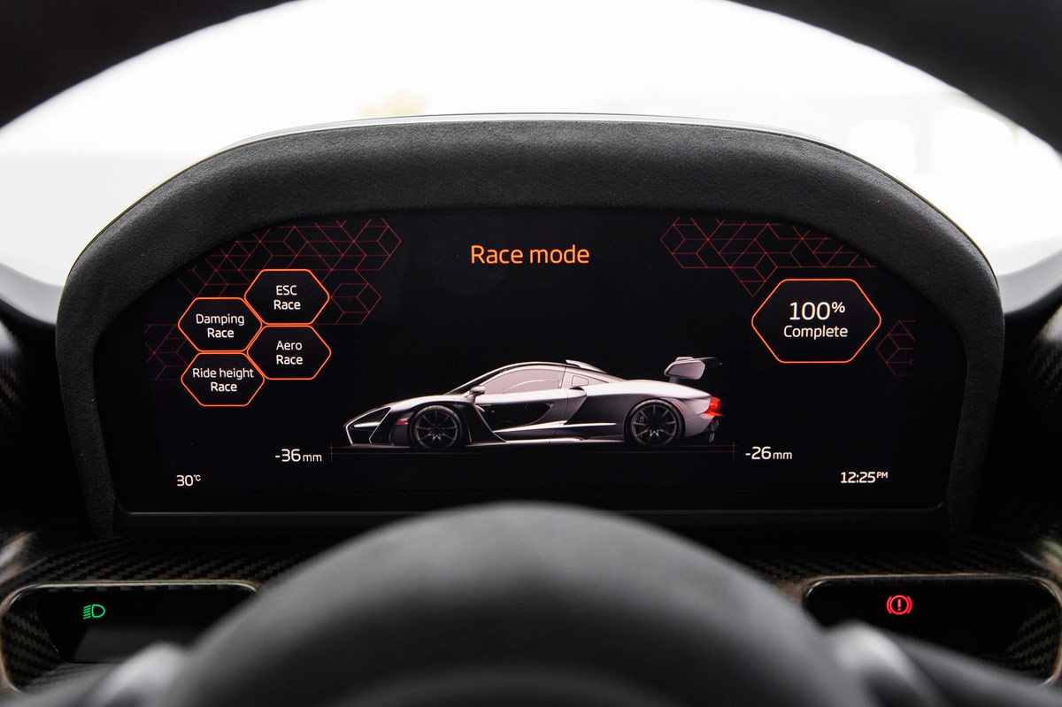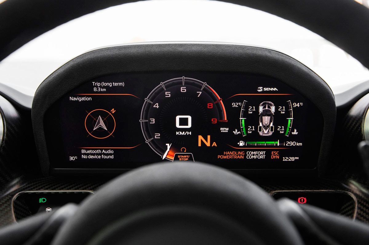 Con toda esta información bajo el brazo, debo decir que empiezo la prueba del Senna con mucho respeto por una maquina tan espectacular. El botón de arranque se encuentra en el techo, para dar más impresión de estar en algo que tiene cuatro ruedas pero que de coche tiene poco. ¡Parece una nave espacial!