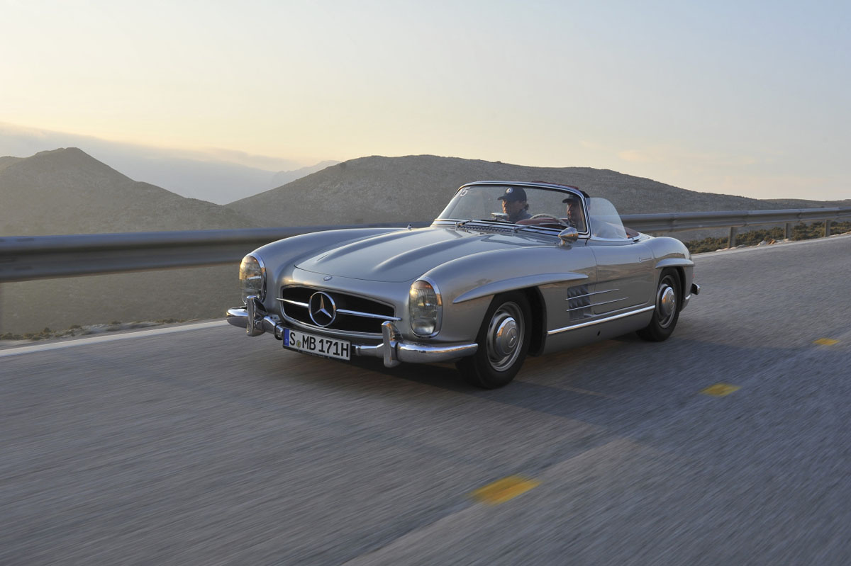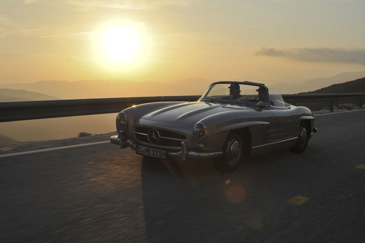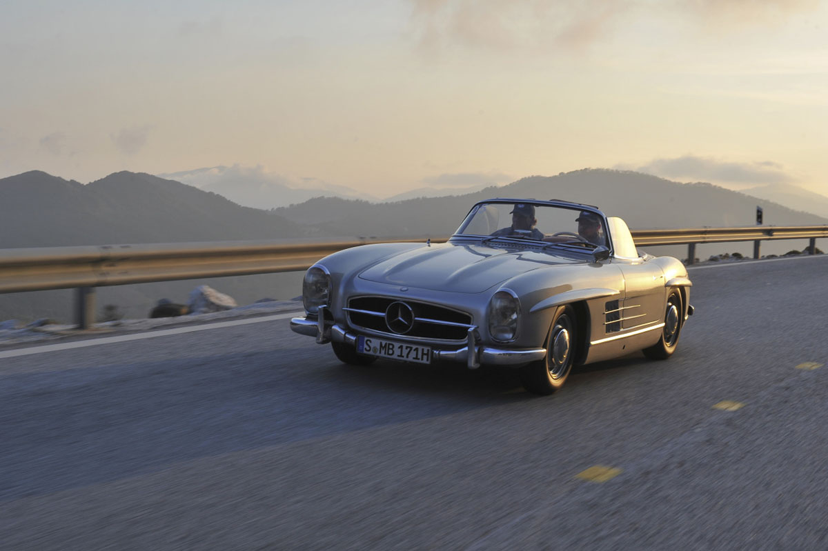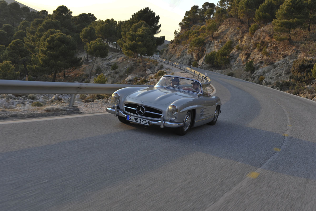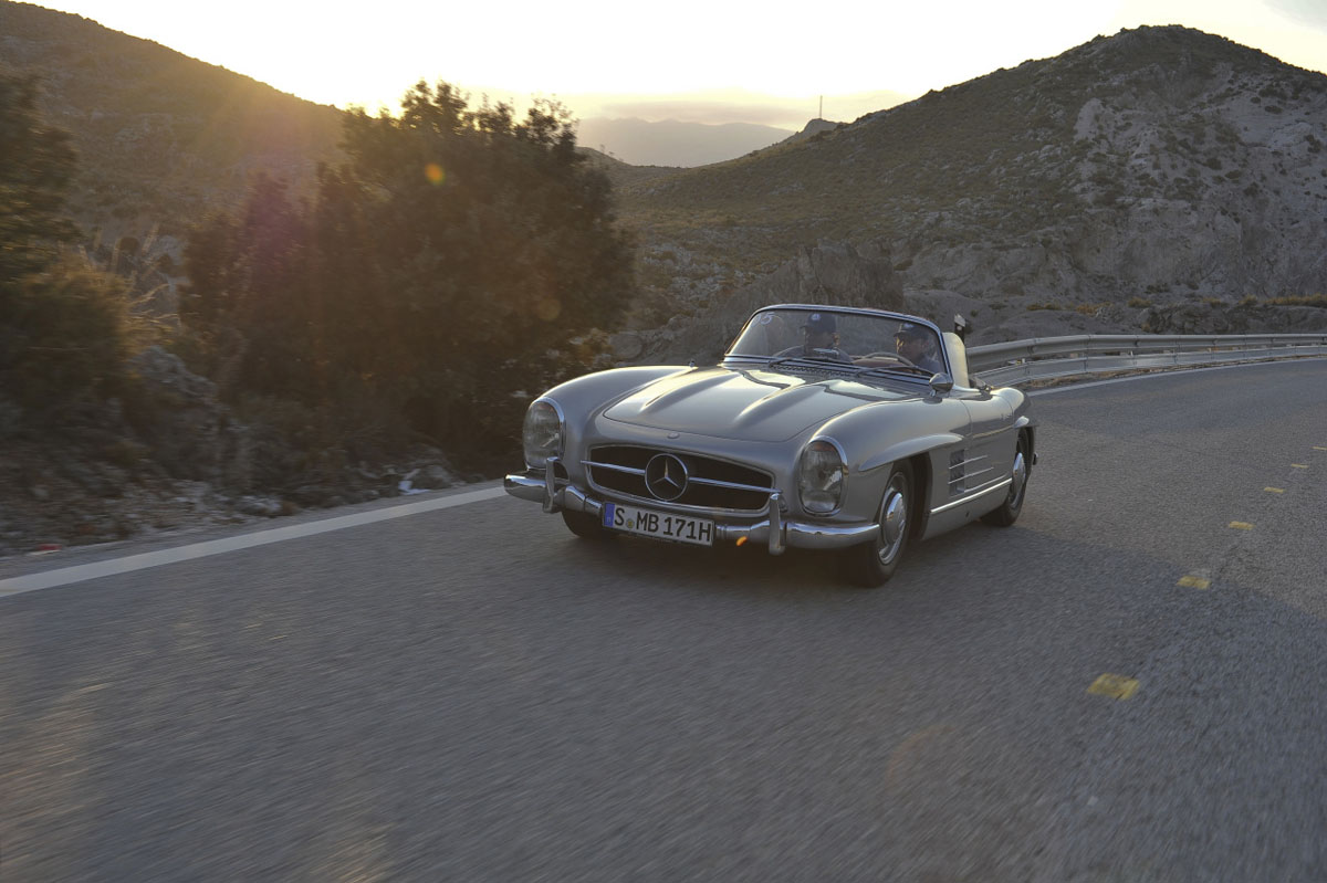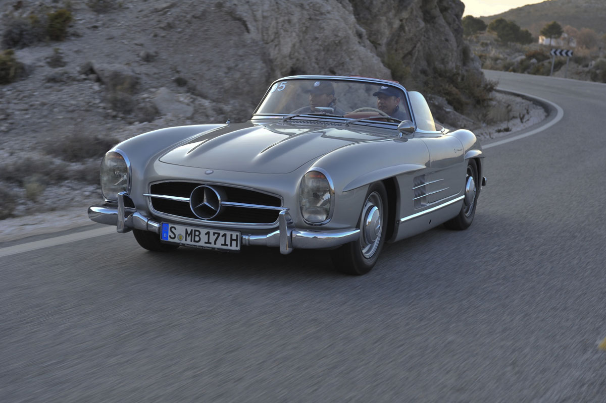 El protagonista de esta prueba, el Mercedes 300 SL Roadster, es uno de los coches más míticos que se han fabricado, ensombrecido por la versión coupé que se convirtió en leyenda por sus puertas en forma de ala de gaviota, pero lo cierto es que el descapotable es mejor coche en todos los aspectos y en los últimos tiempos se está haciendo justicia y sus cotizaciones ya están muy parejas.