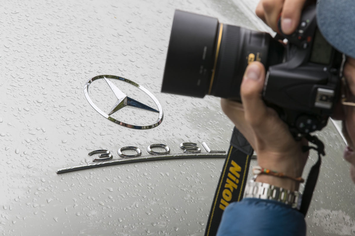 Termino la prueba dinámica del Mercedes 300 SL Roadster. Paramos a ver el coche con calma, contemplar el motor que hay bajo el capó delantero, que no es nada bonito a la vista, bueno, lo poco que se ve, porque está casi todo tapado por los tubos de admisión, el filtro y las tuberías del sistema de inyección directa de gasolina.