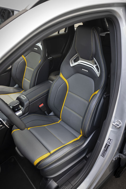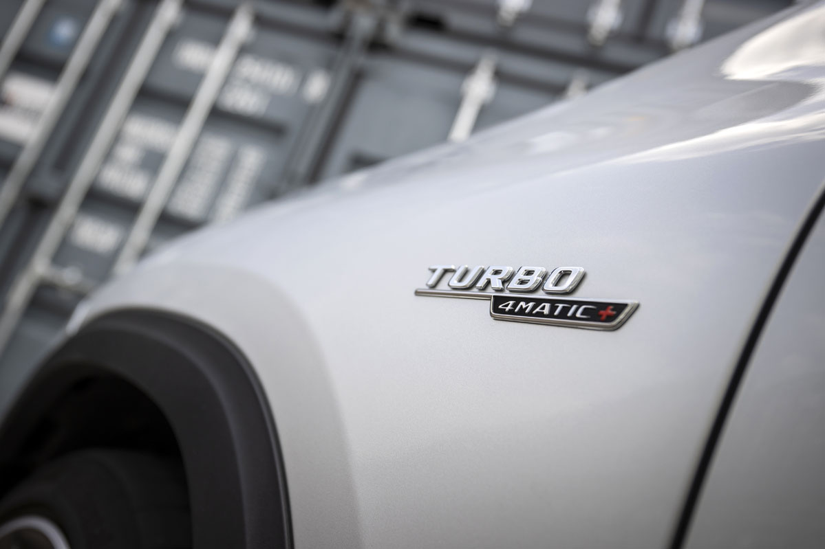 La versión de la prueba, el Mercedes AMG 45 S 4MATIC+, se distingue por un sinfín de añadidos estéticos que dejan claro que este no es un GLA convencional del primer vistazo. Así, nos encontramos con parrilla y defensas específicas con mayores tomas de aire, enormes llantas de 20” que dejan a la vista potentes frenos AMG de 4 pistones delante, retrovisores en negro, y ya en la trasera, defensa con difusor y cuádruple salida de escape y un alerón que llama mucho la atención. Para terminar, en todo el contorno de la carrocería se han eliminado los cromados y han sido sustituidos por elementos en negro, que cambian el aspecto elegante por el deportivo.