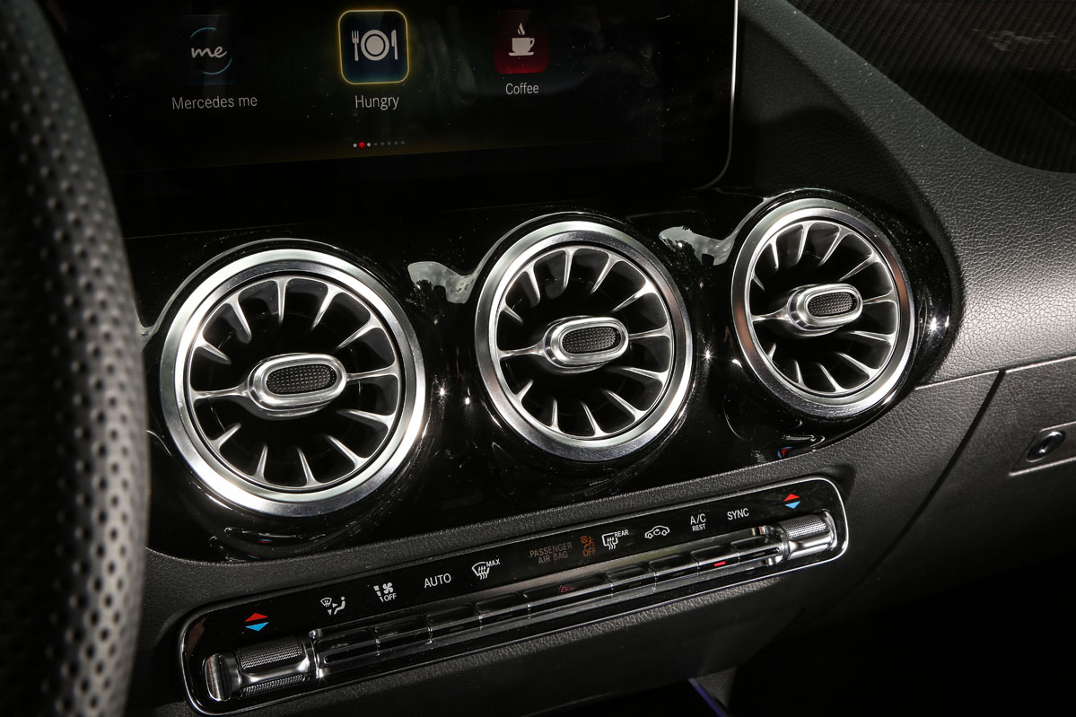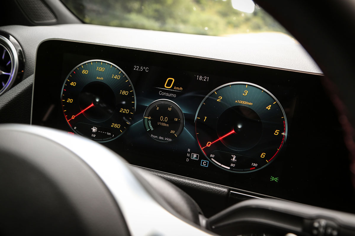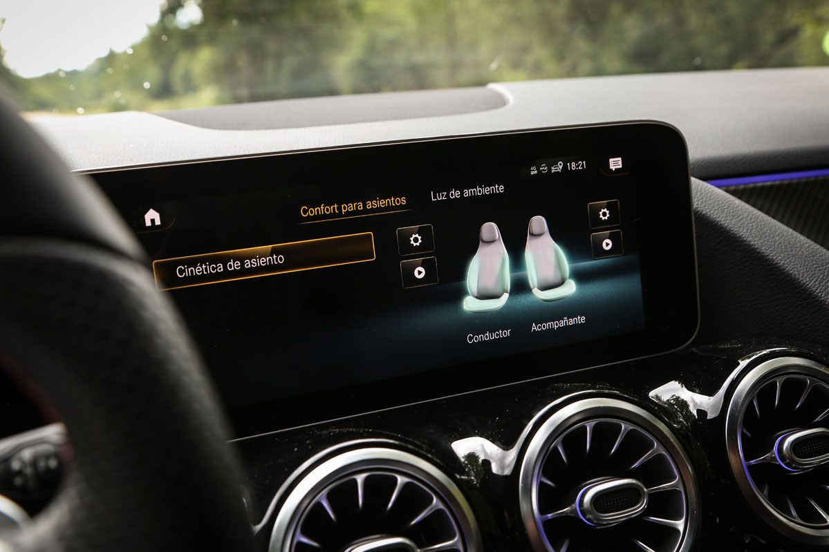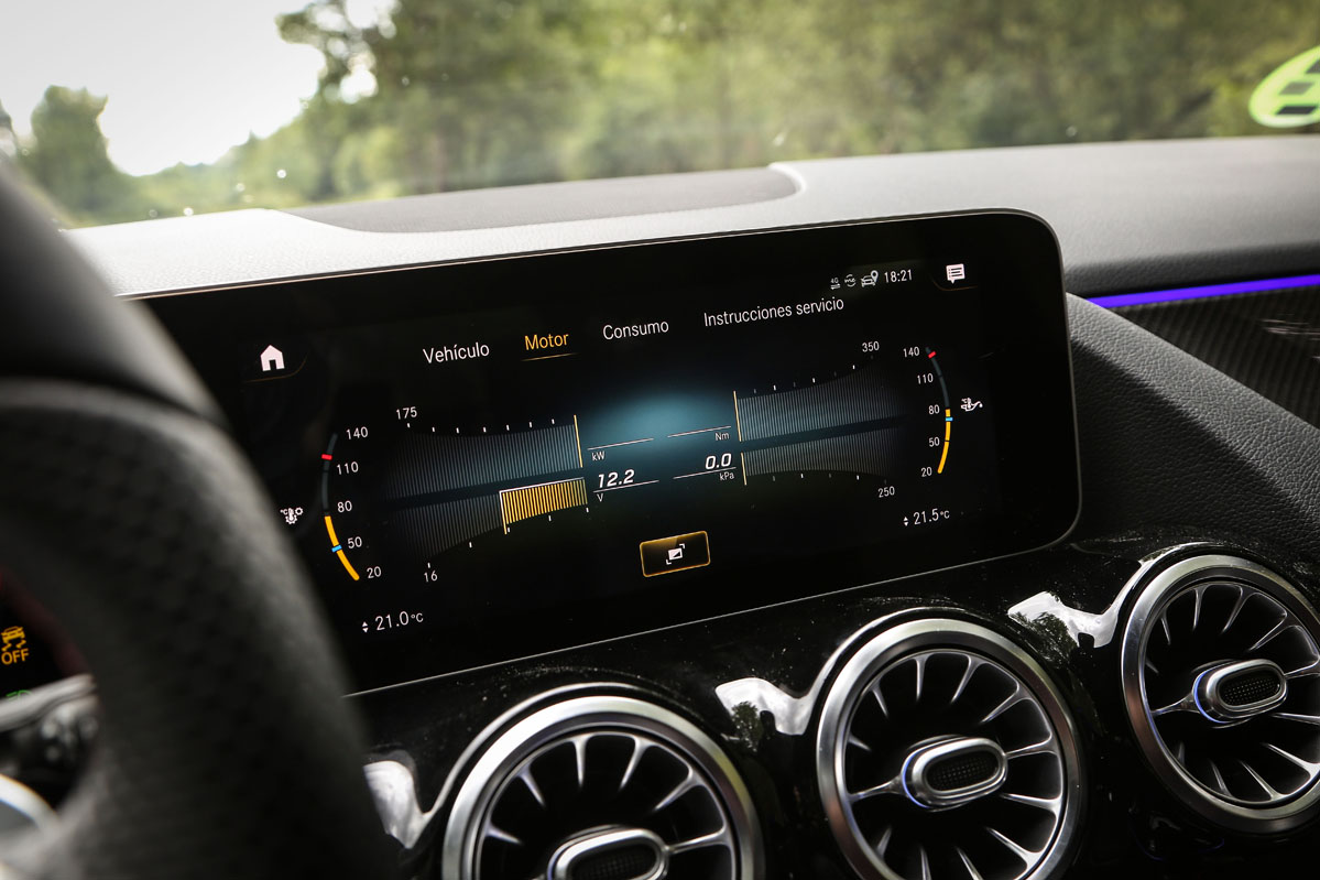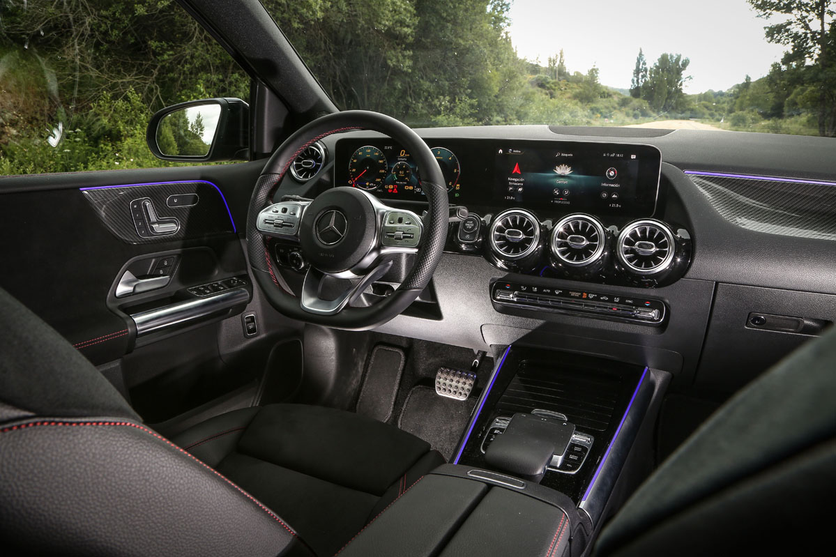 Dentro hallo las diferencias más notables respecto a la generación anterior. El Mercedes B 200 d 8G-DCT de la prueba adopta un diseño top, donde las pantallas son las auténticas protagonistas. Las dos son de 10,25 pulgadas (26 cm) y tienen unos gráficos de alta calidad creados por la empresa NVIDIA -si te van los videojuegos seguro que te suena-. Una de ellas hace de cuadro de instrumentos digital, mientras que desde la otra se controlan, de forma sencilla, todas las funciones del sistema de infoentretenimiento. Hay algunos plásticos mejorables, pero en general la calidad percibida es muy buena, en gran parte debido a las pantallas, pero también a las toberas de ventilación tipo turbina y a la conseguida iluminación ambiente.