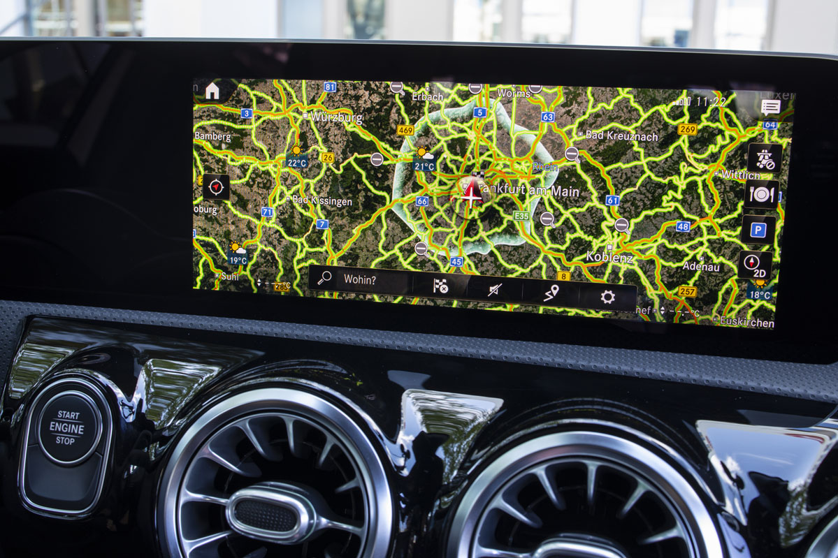 Si lo tuyo es el modo eléctrico, que sepas que el coche te ayuda para cumplir con el cometido del litro a los 100 km en un consumo combinado. Para ello, además de contar con los niveles de retención D--, D-, D, D+, D+ Auto -en el nivel Electric se activan en las levas, porque en los otros, accionarlas supone subir o bajar de marcha- tenemos el asistente Eco, con el que el coche se anticipa mediante la navegación y el sistema de radar para recudir la velocidad por sí solo; por ejemplo, cuando el coche tiene suficiente velocidad al llegar al semáforo o cruce, o si detecta que hay tráfico, en una cuesta... También cuando hay poca distancia respecto al coche que nos precede, al levantar el pie del acelerador, retendrá mucho, o si por el contrario no hay nada delante, el vehículo circulará por inercia para aprovechar al máximo la energía cinética que llevamos -según Mercedes, con estas indicaciones se puede ahorrar hasta un 5%- (toda la información resumida). Asimismo, el pedal tiene una especie de leve tope a mitad del recorrido que nos marca dónde finaliza la propulsión eléctrica. Porque cuando necesitamos toda la potencia, por ejemplo, para un adelantamiento, al pisar el acelerador a fondo, el motor de combustión entra en funcionamiento, independientemente del modo en el que se circule.