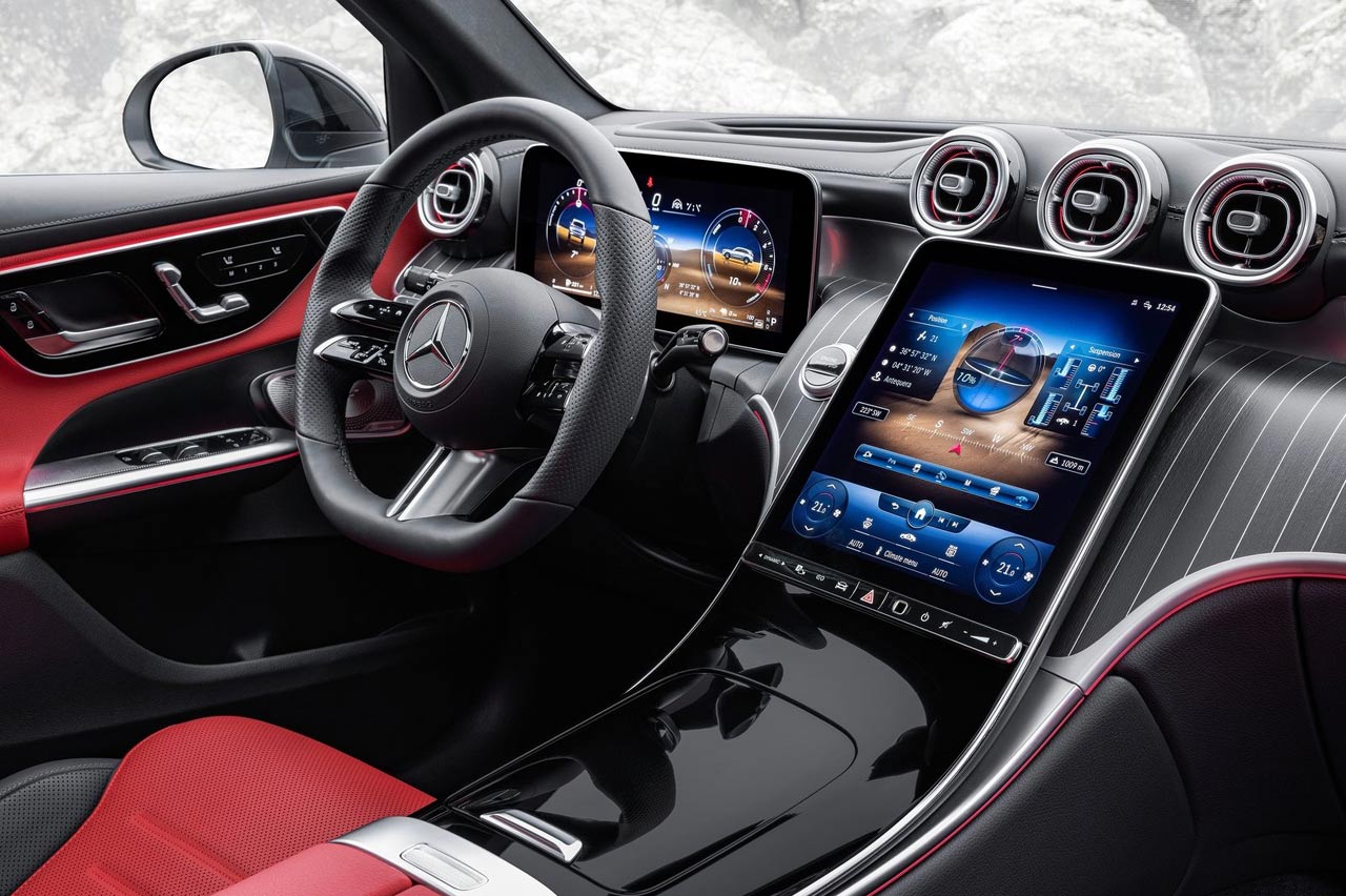 El habitáculo del Mercedes GLC 300 de 4Matic de la prueba es un espectáculo. Ofrece un diseño que podría calificarse de minimalista por la casi total ausencia de controles físicos pero que, al mismo tiempo, viene cargado de tecnología. Fíjate en ese cuadro de mandos digital (con pantalla de 12,3 pulgadas) o en la gigantesca pantalla táctil central en formato vertical (11,9”) desde la que se controlan casi todas las funciones del coche de forma muy intuitiva.