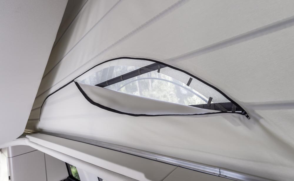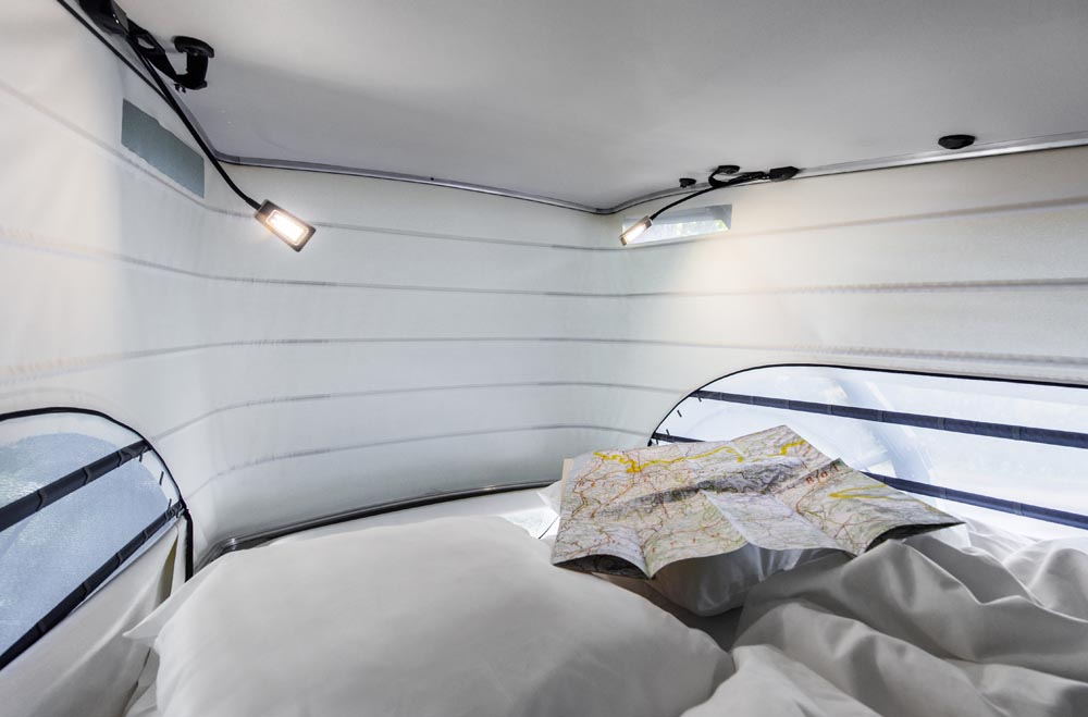 Si eres de las personas a las que no les dan miedo las alturas, siempre puedes dormir en el 'planta' de arriba. Con tan solo pulsar un botón (en la Activity es manual), el techo se despliega y aparece una cama, con luces de lectura, para dos ocupantes. Posiblemente sea la mejor elección si no quieres montar y desmontar el chiringuito de abajo cada vez que quieras dormir. Su colchón de espuma, que es para dos personas y que cuenta con una superficie aproximada de 2,05 x 1,13 m, es cómodo, muy cómodo. Asimismo, en esta ‘boardilla’ tan particular cuentas con mayor espacio para las piernas que en la generación anterior; esos 17 centímetros de más con los que cuenta la parte posterior se ha conseguido gracias al nuevo sistema de bisagras.